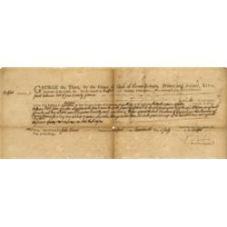 <b>529. ARTHUR ST. CLAIR </b>(1734 - 1818) Revolutionary War major general serving at Trenton and Princeton, commanded Ft. Ticonderoga, President of the Continental Congress and first governor of the Northwest Territory. Partly-printed D.S. "<i>Ar. St. Clair</i>", 1p. 13" x 5 1/4", Bedford Co., July 17, 1772, wherein in the name of George III, the Sheriff of Bedford is ordered to arrest one Jacob Coleman for an assault against another prisoner whom Coleman did "<i>evilly treat</i>". Some toning, particularly at folds with one pinhole thereat, else very good.<b> $250-350</b>
