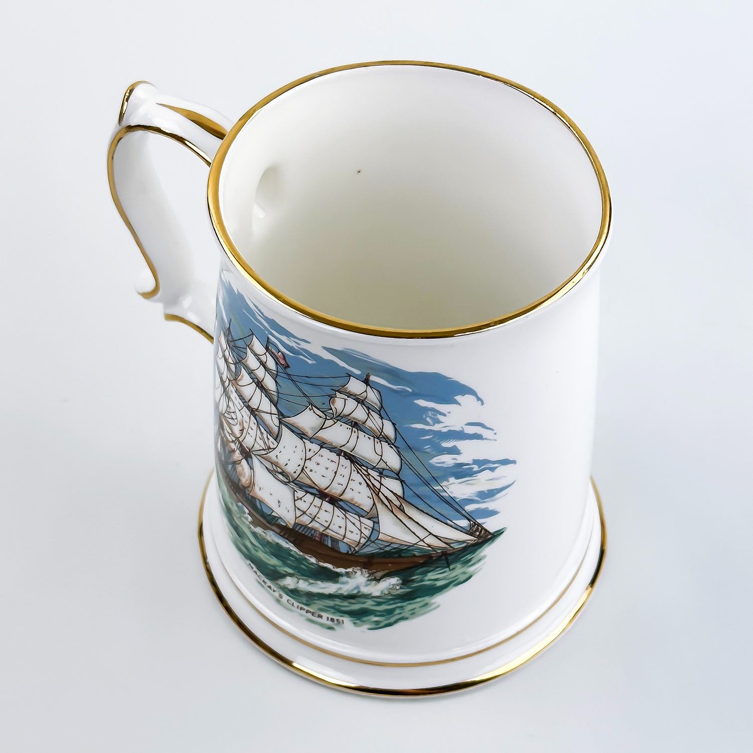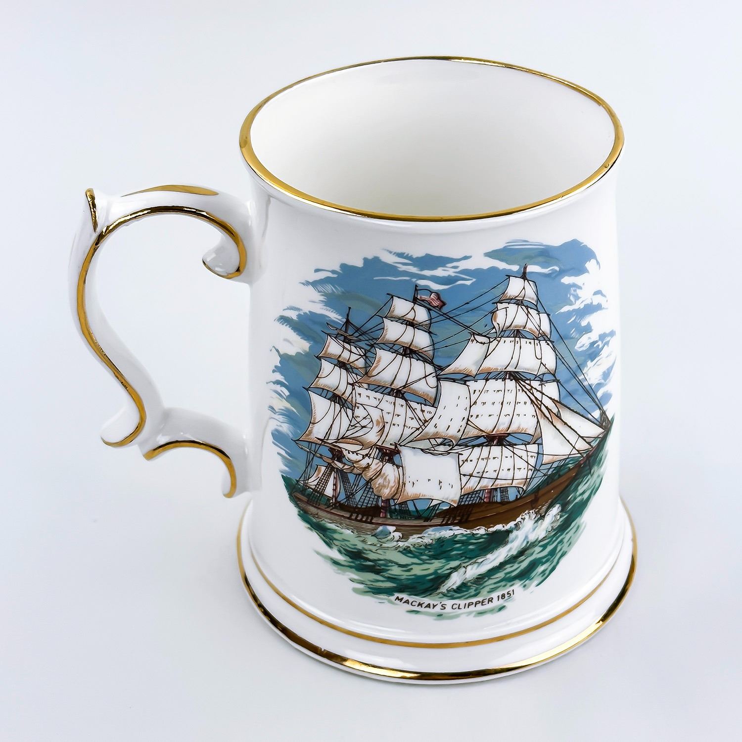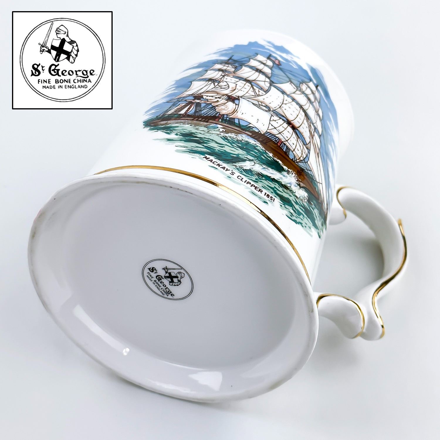 #8349 - ST. GEORGE FINE BONE CHINA MUG CUP STEIN - ENGLAND. MUG DEPICTS MACKAY’S CLIPPER 1851 SAILING SHIP. NOTE: I BELIEVE THAT MACKAY IS SPELLED WRONG AND SHOULD BE MCKAY’S CLIPPER. BEER MUG IS CLEAN AND LOOKS LIKE NEW WITH GOLD TRIM. MEASURES: 4.75” (12 CM) TALL BY 5.5” (14 CM) WIDE - INCLUDES HANDLE AND 4.25” (11 CM) DIAMETER BASE