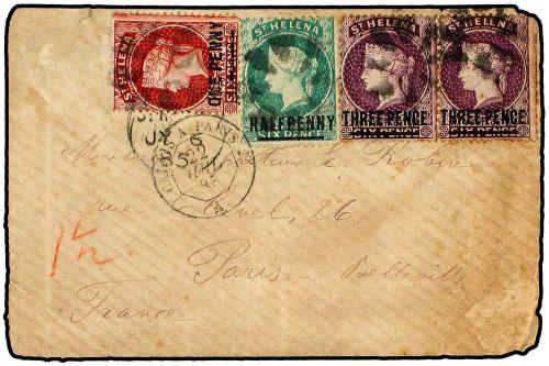 1885 Cover used to PARIS franked by 1884-94 1/2 d. green, 1864-80 1 d. lake & 3 d. pair ovpts (SG 34, 7, 11) all cancelled by the CORK h/stamps & the 1 d. by the ST HELENA cds. Backstamps of LONDON transit & PARIS arrival with French TPO on the face.