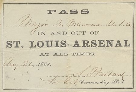 SIDNEY BURBANK (1807 - 1882) Union officer who led a brigade of U.S. Regulars at Chancellorsville and at Gettysburg. At the Wheatfield his brigade was flanked and all but destroyed. Rare D.S., 1p. 12mo., Aug. 22, 1861, a partly-printed pass allowing passage in and out of the St. Louis Arsenal to Maj. Nathaniel C. Macrae. Very good. The St. Louis Arsenal was defended by future general Nathaniel Lyon earlier that year against Missouri militiamen armed by Jefferson Davis who sought to capture the armory. The fighting spilled into the streets of the city causing many civilian deaths as the captured militiamen were marched off as prisoners.