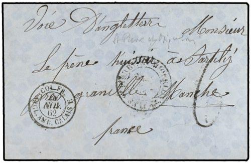 1862 Stampless envelope to France cancelled by double ring ST. PIERRE AND MIQUELON datestamp (Jamet 4) charged "6" with adjacent French entry cachet, endorsed "via England" with French arrival on reverse.