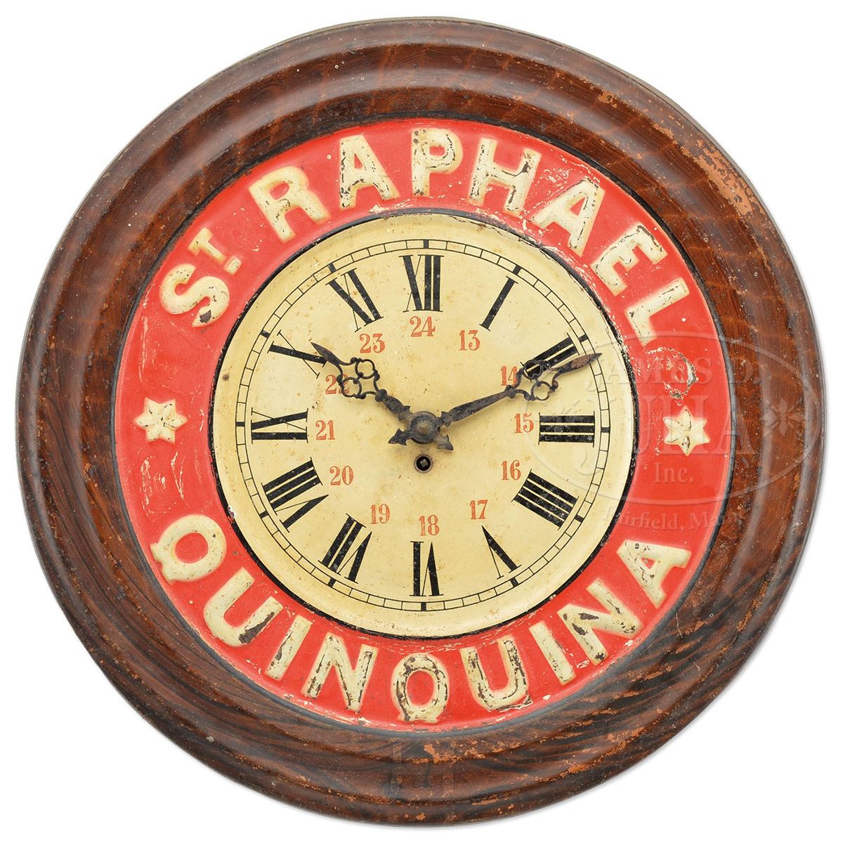 Early 20th century tin cafe clock to promote the beverage "St. Raphael Quinquina". Windup brass clock movement. SIZE: 19" dia. CONDITION: Good; missing key. 1-13270