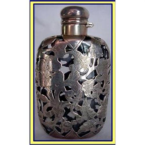 Sterling silver overlaid glass perfume / scent bottle. Made 19th century, USA.<BR>7 inches high.<BR>Flask shaped bottle with exceptional silver overlay in the form of an openwork floral and foliate design. <BR>Very rich with added engraved detail. Solid silver neck and hinged cap.<BR>Marked near the bottom with a patent number and SOLID SILVER. <BR>Unfortunately, the neck is badly chipped/shattered(see photo), albeit hidden under the silver and only <BR>noticeable when the lid is opened.