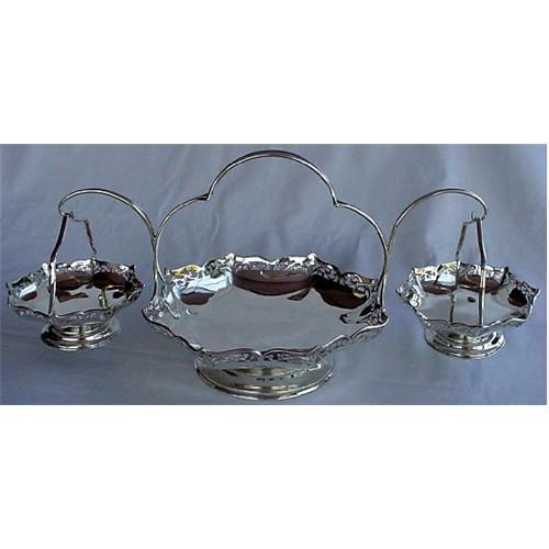 Beautiful triple basket sterling silver epergne or centerpiece, made Birmingham, 1911. 20inches from end to end, 8 3/4inches high. Weighs about 28oz. Central basket / centerpiece with curving arms that hold a pair of smaller identical baskets. All have scrolling edges with delicate openwork borders. Round bases. Handle of central basket is like a clover and also has openwork on the wide section near the top. Each basket is hallmarked. Maker seems to be WB/LD. Anchor, lion and date mark M. Condition is very good - no damage of any sort.