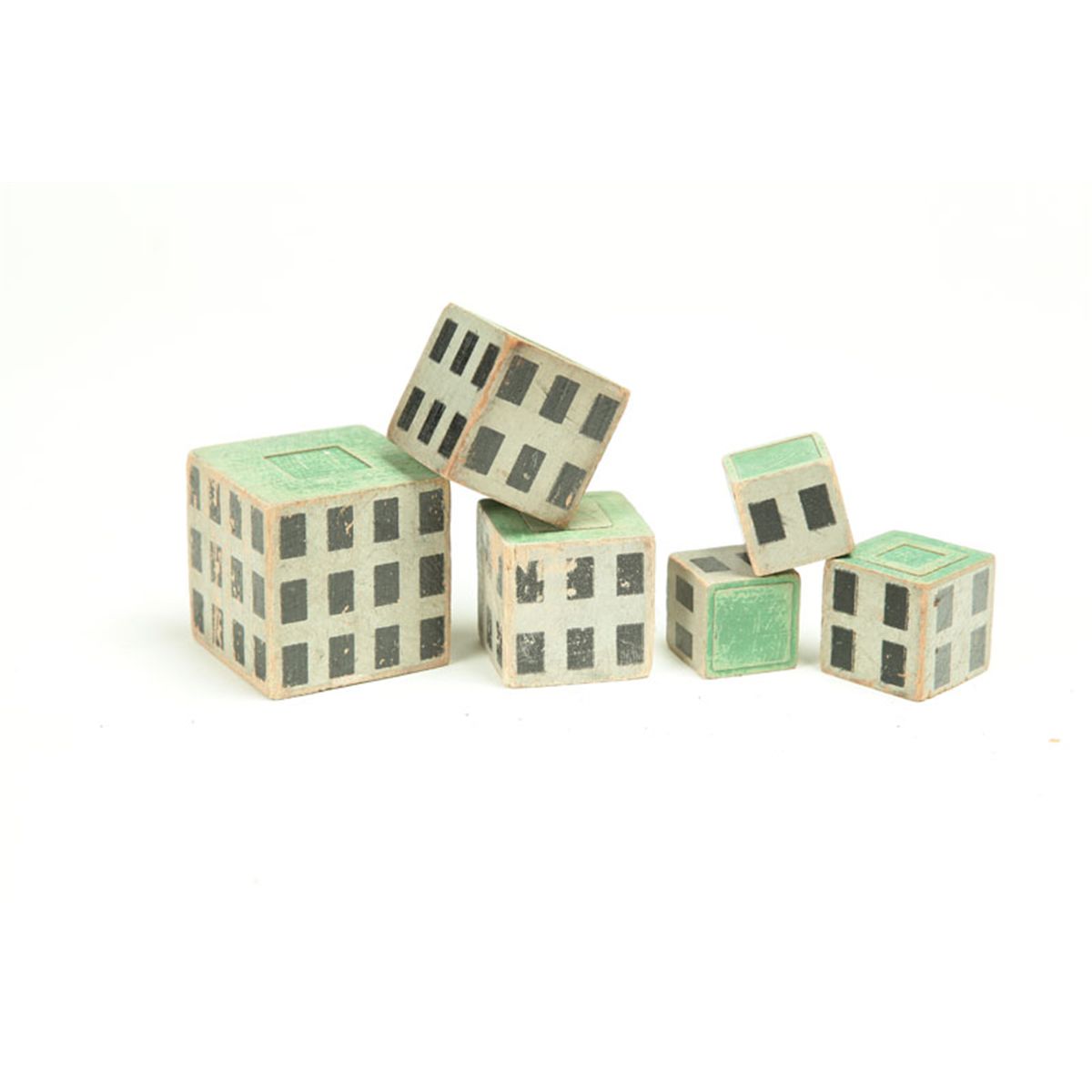 Early 20th century, hardwood, possibly maple. Six graduated blocks painted to look like a skyscraper when stacked. 9"h. Ex Michael Kellogg (Ohio).