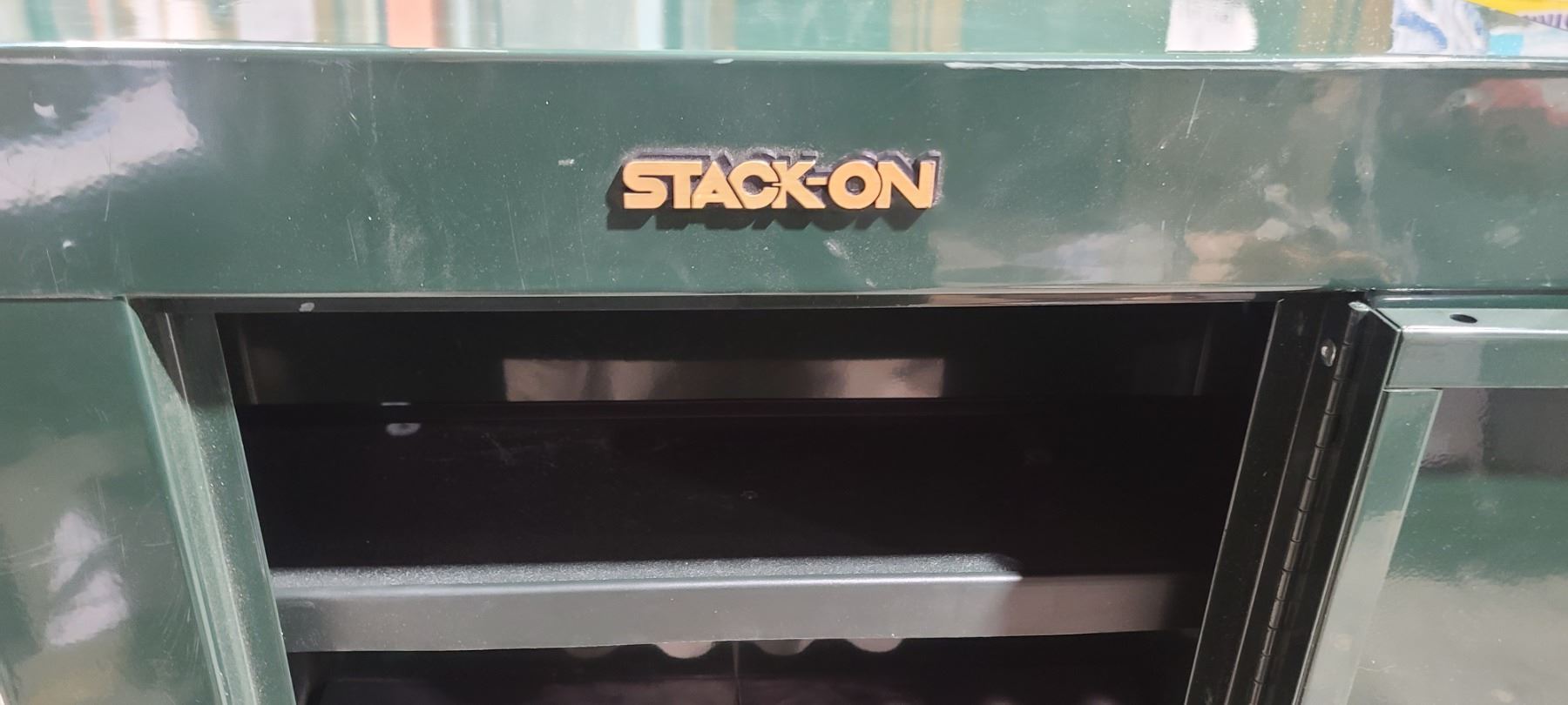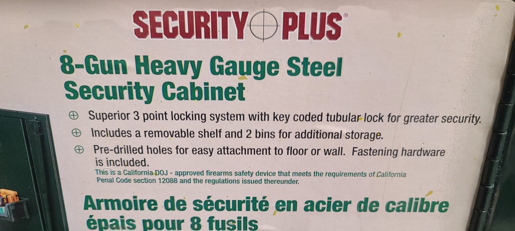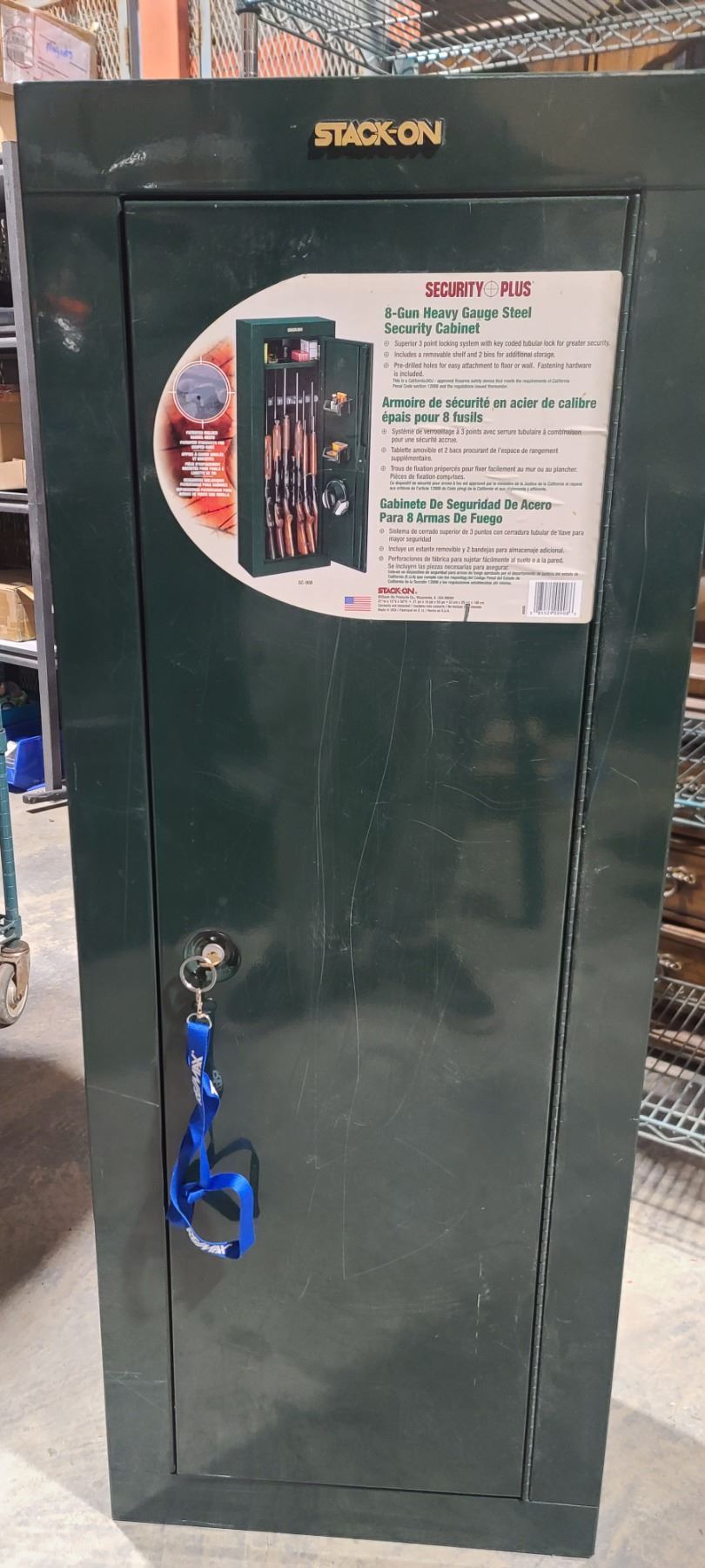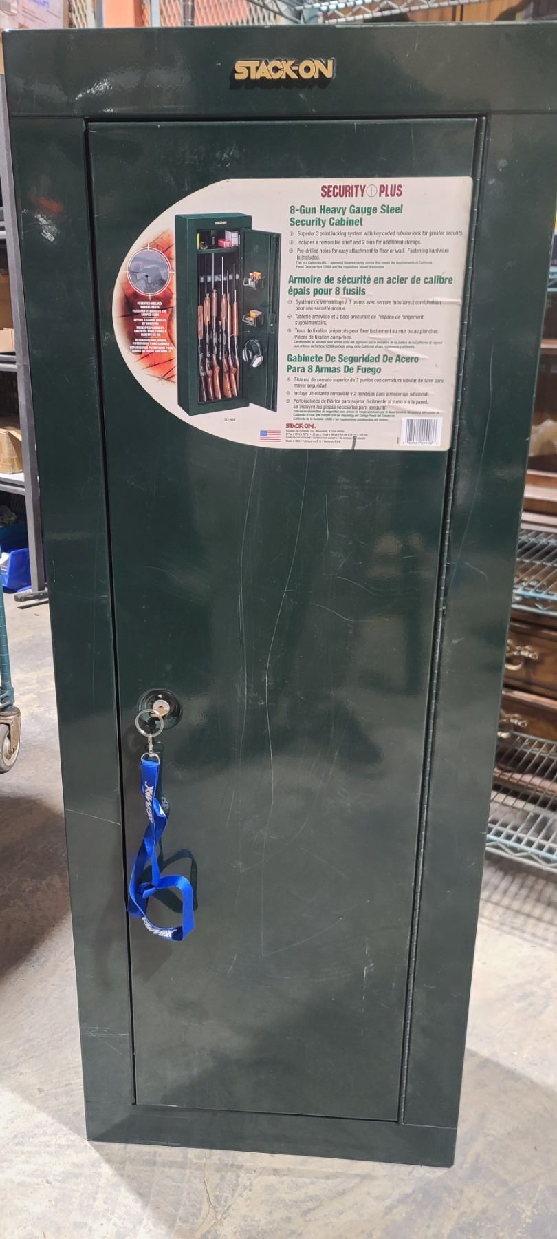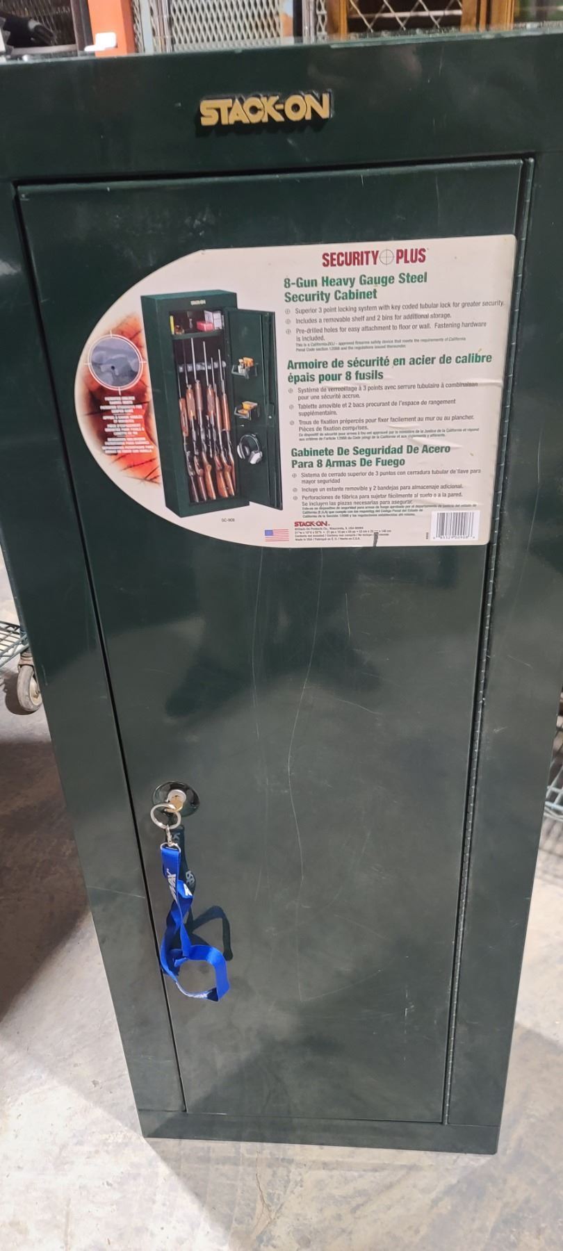 STACK ON 8-GUN 55 X 21 X 10" HEAVY GUAGE STEEL SECURITY CABINET COMES WITH ONE KEY (KEY HAS A NUMBER ON BACK OF SAFE) AND MOUNTING HARDWARE