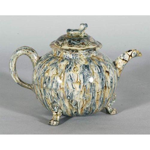 1 STAFFORDSHIRE AGATEWARE TEAPOT 5 1/2" high 18th century CONDITION REPORT: one foot broken off and neatly glued back, a few very minor chips to rim, tip of spout and one foot. PACKING AND SHIPPING (excluding insurance) by Fairfield Auction to points within the Continental U.S.A. and Canada (all other international must be handled by 3rd party shipper) $30.