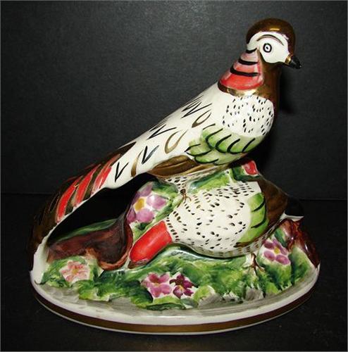 STAFFORDSHIRE PEACOCK FIGURINE. Figurine depicts a pair of peacocks. Peacocks have applied gilt, red, green, and black paint. No mark. 5.125” H