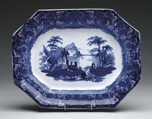 STAFFORDSHIRE BLUE AND WHITE SCENIC PLATTER. Dark blue scene of people around lake with castles. Nice deep blue border. Impressed mark to reverse with registry mark. SIZE: 15-1/4” x 12”. CONDITION: Very good. 9-26626