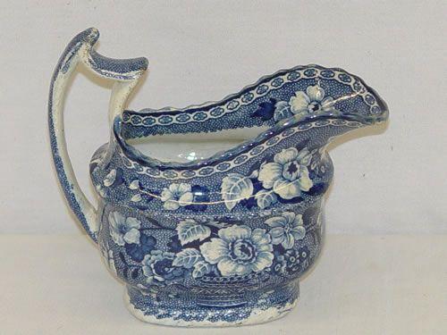 STAFFORDSHIRE BLUE CREAMER W/ BASKET OF FLOWERS DESIGN - MINOR GLAZE WEAR