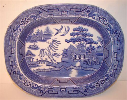 WILLIAM ADAMS (1893-1917) STAFFORDSHIRE BLUE WILLOW PLATTER. Depicts an Oriental scene with building along river. Shows one tight hairline crack at bottom. Marked on bottom “Warranted/Staffordshire/W. Adams & Sons/England”. 13” L