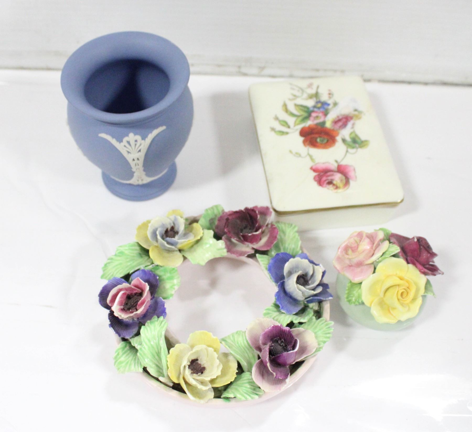POSEY, VINTAGE WEDGEWOOD BONE CHINA TRINKET BOX (HAS BEEN REPAIRED), AND VINTAGE WEDGEWOOD BLUE JASPERWARE "URN" **ALL ITEMS MUST BE REMOVED BY 5PM SATURDAY, JULY 22ND 2023. ALL REMAINING ITEMS WILL BE SUBJECT TO A $6.00 PER DAY STORAGE CHARGE. ANY ITEMS REMAINING AFTER MONDAY, AUGUST 7TH, 2023 WILL BE CONSIDERED FORFEITED. NO REFUNDS WILL BE ISSUED FOR FORFEITED ITEMS. TO SCHEDULE A PICK UP APPOINTMENT CLICK HERE