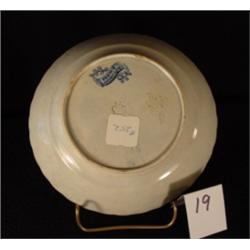 Blue & white staffordshire bowl, transferware with scalloped rim, ca 1840-1850. 6.25" diameter. Impressed Prince of Wales feathers mark & ink stamped banner, "French Landscape". 2 tiny chips under foot not visible when sitting flat, no other notable flaws.