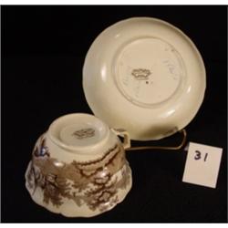 Staffordshire teacup & saucer, brown & white transferware w/scalloped rim, ca 1840-1850. Ink stamped "Muleteer/Davenport", and impressed with annular mark of the Davenport factory. Cup is 2.25" tall & 4" across and has slight pressure-caused ding on rim near handle: saucer is 5 5/8" in great shape.