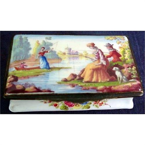 Enamel gilt-metal-mounted snuff box late 18th century made Staffordshire, England. <P><P> Measures 3 5/8" long, 2" wide and 1 1/4" high. <P><P> Rectangular form, the hinged cover painted with two ladies and a companion fishing from the banks of a tranquil river with their dog, the sides and inside of the cover with sprays of flowers on a white ground. Some minor restoration to the bottom, but otherwise very good condition.