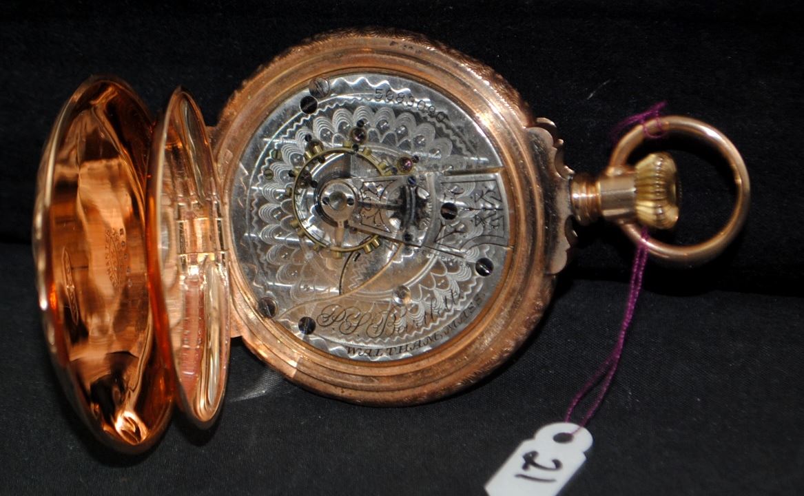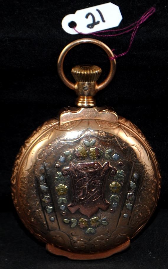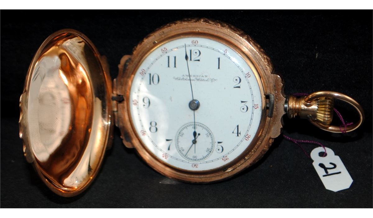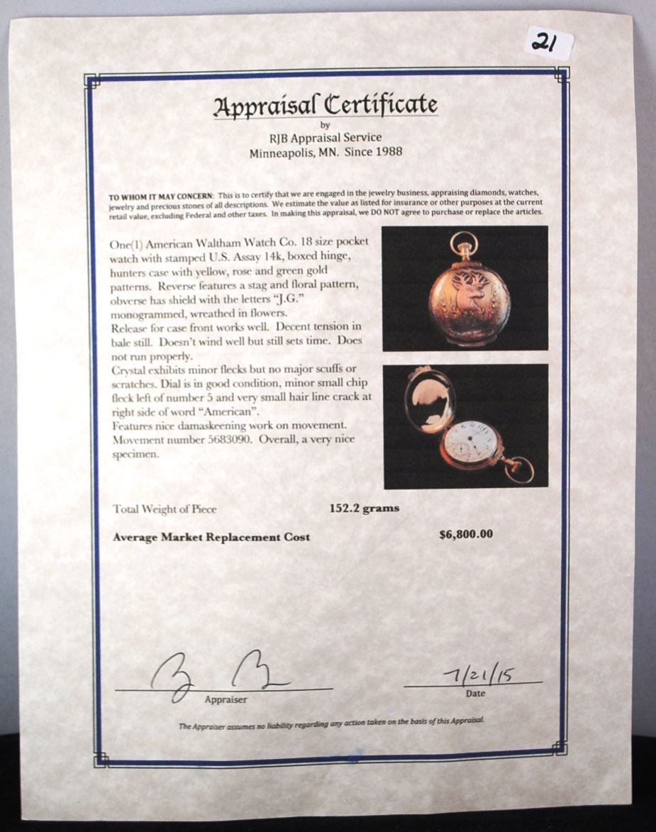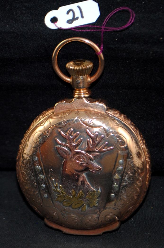 AMERICAN WALTHAM WATCH CO. 18 SIZE POCKET WATCH WITH STAMPED U.S. ASSAY 14K, BOXED HINGE, HUNTERS CASE WITH YELLOW, ROSE AND GREEN GOLD PATTERNS. REVERSE FEATURES A STAG AND FLORAL PATTERN, OBVERSE HAS SHIELD WITH