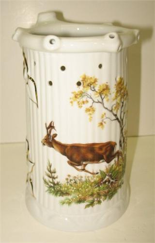HANDLED STAG & GILT DECORATED VASE. Single branch form handle. Unmarked. Crazing at bottom. 7.5” H