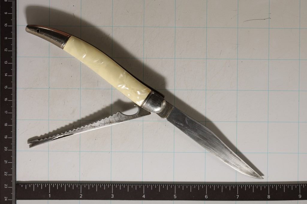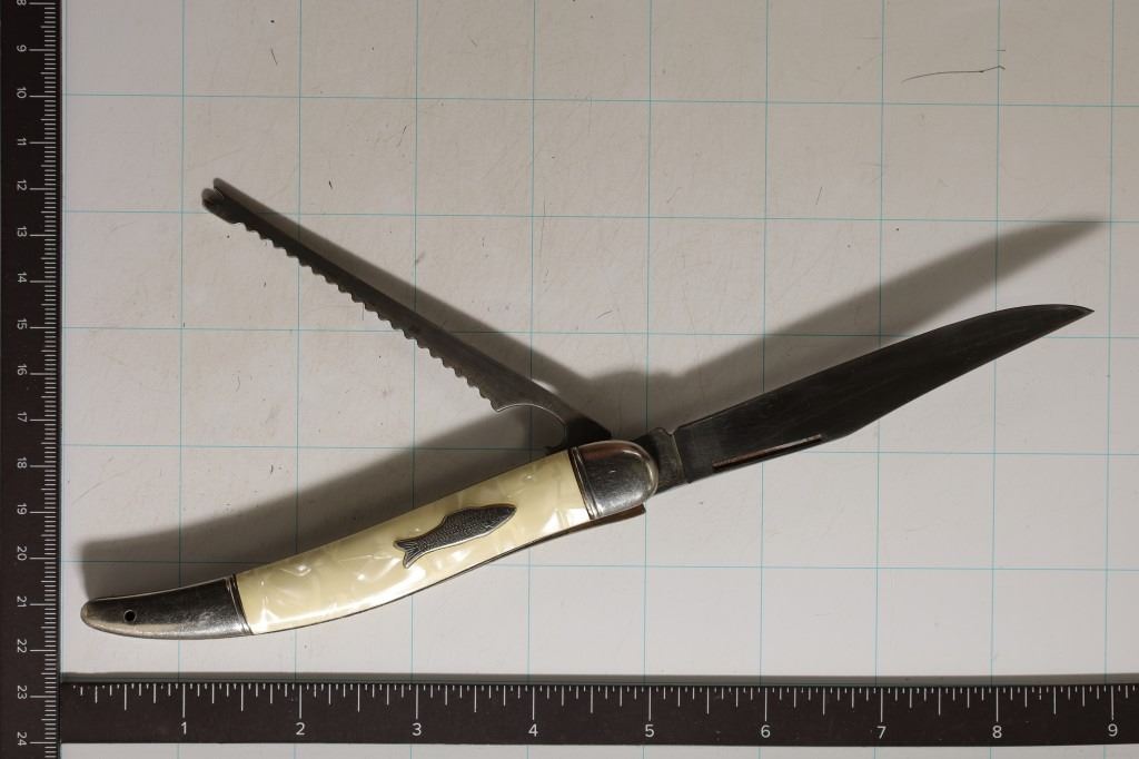 STAINLESS STEEL WITH MOTHER OF PEARL HANDLE AND FISH EMBLEM