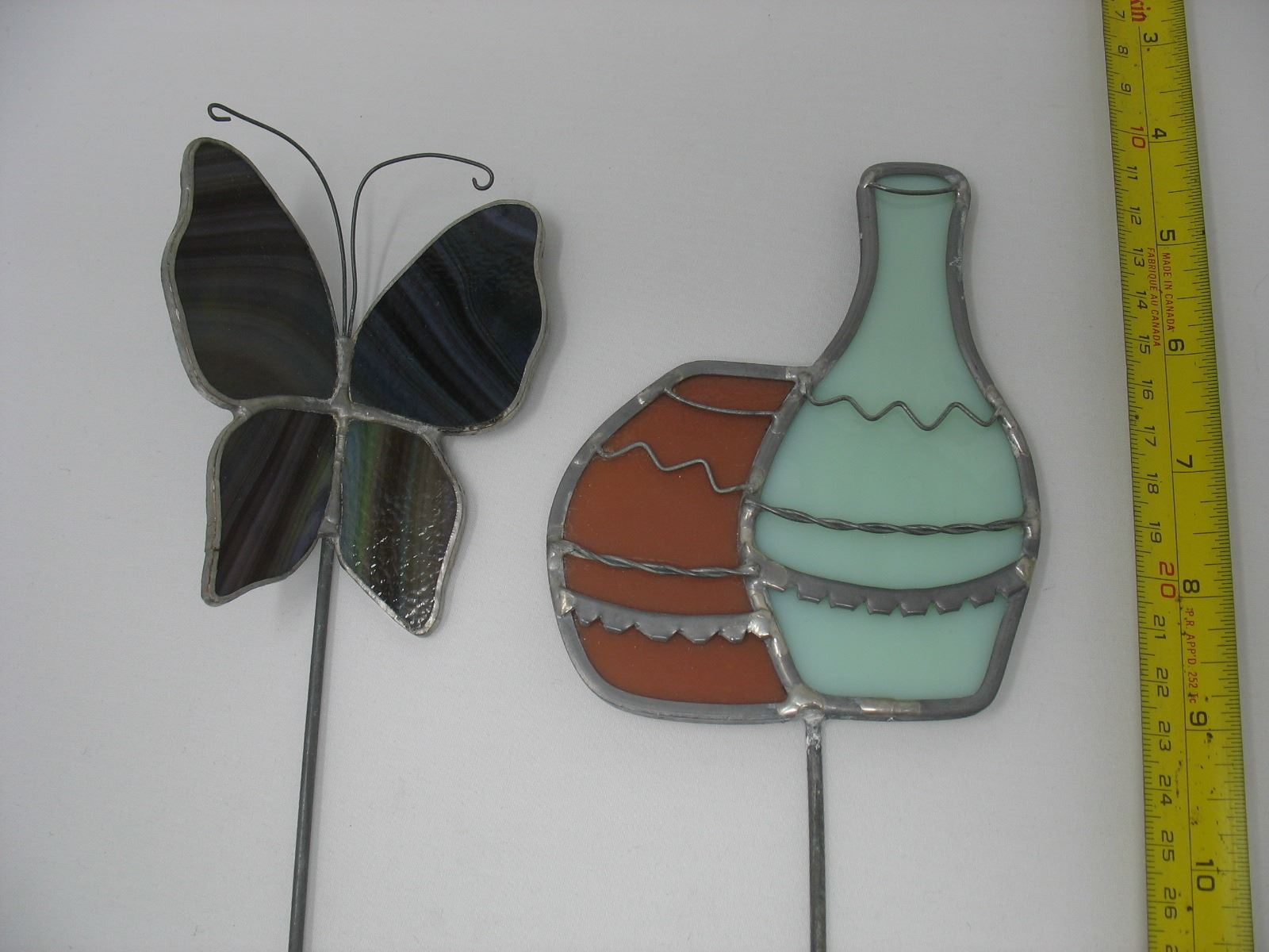 STAINED GLASS - 2 PIECES - BUTTERFLY & BOTTLE - Steel Stakes for Plant Pots