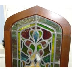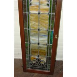 STAINED GLASS CHURCH WINDOW. Wooden frame with brass knob. 16.75" x 54.5"