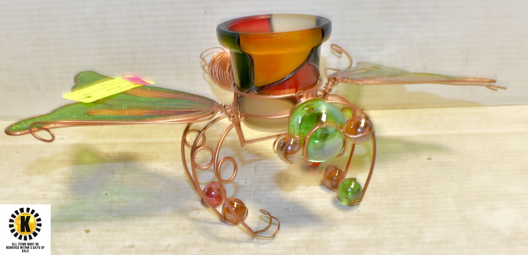 STAINED GLASS DRAGON FLY CANDLE HOLDER
