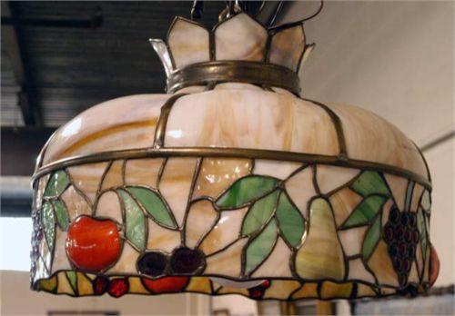 STAINED GLASS HANGING DOME with fruit, 19" diameter, a few small panels with cracks, one broken out, early 20th century,