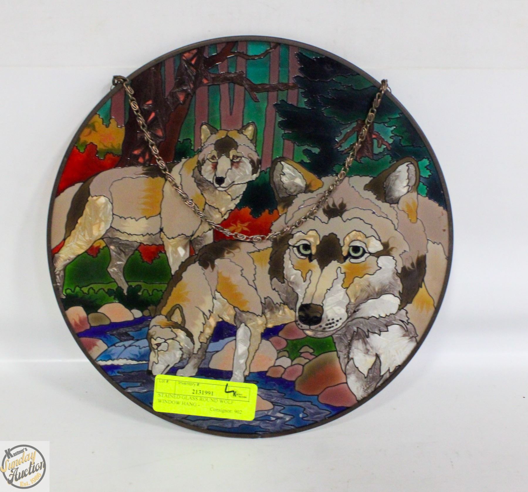 STAINED GLASS ROUND WOLF WINDOW HANG -