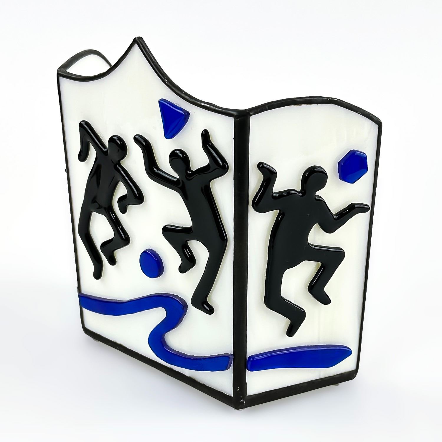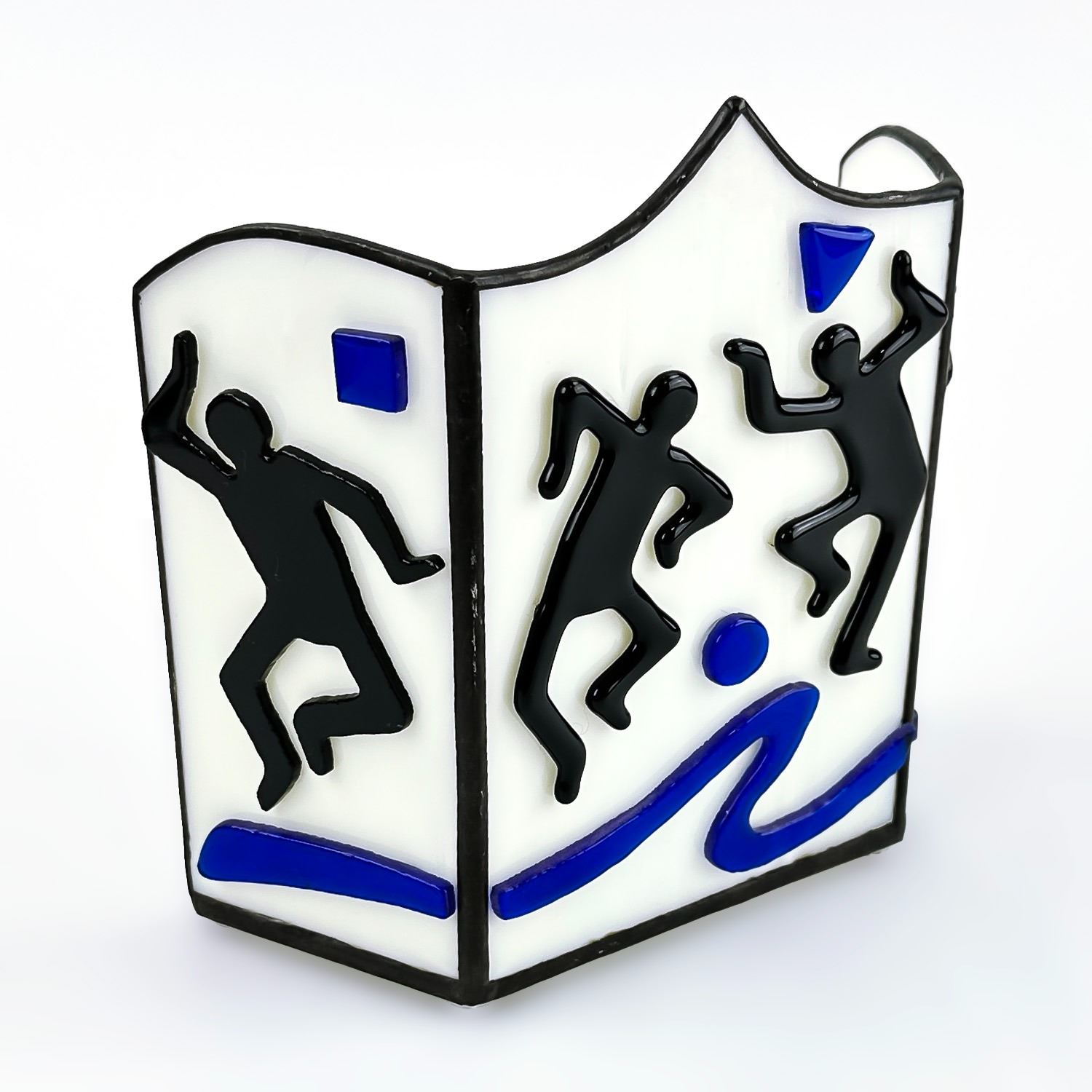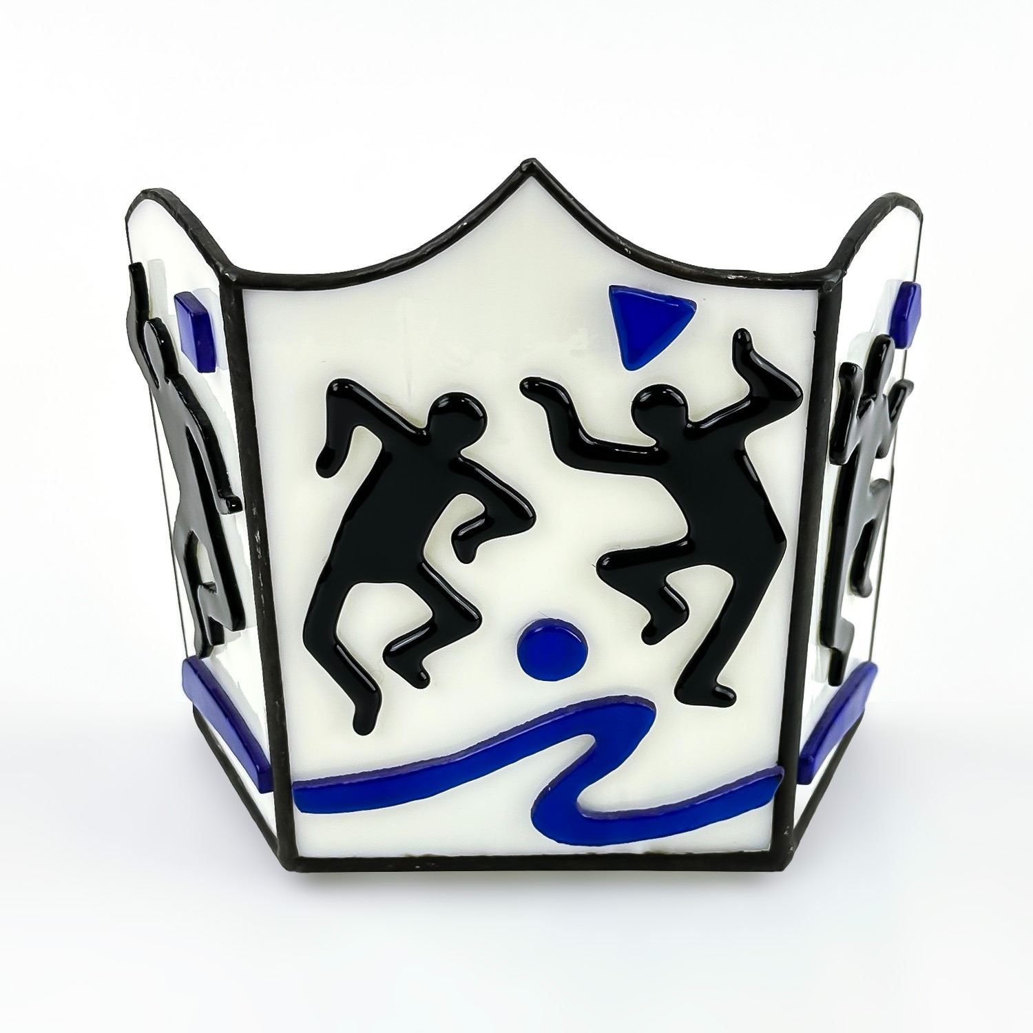 #8530 - STAINED GLASS STYLE VOTIVE OR TEA LIGHT CANDLE HOLDER. RAISED 3D ART GLASS DANCER THEMED SCULPTURE. NO CRACKS, CHIPS OR REPAIRS. MEASURES 6 1/8” (15.5 CM) TALL BY 6.25” (16 CM) WIDE AND 3.25” (8 CM) DEEP