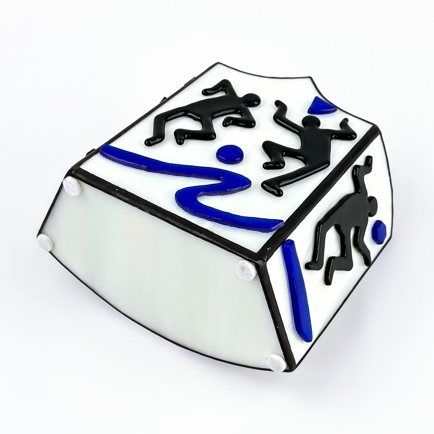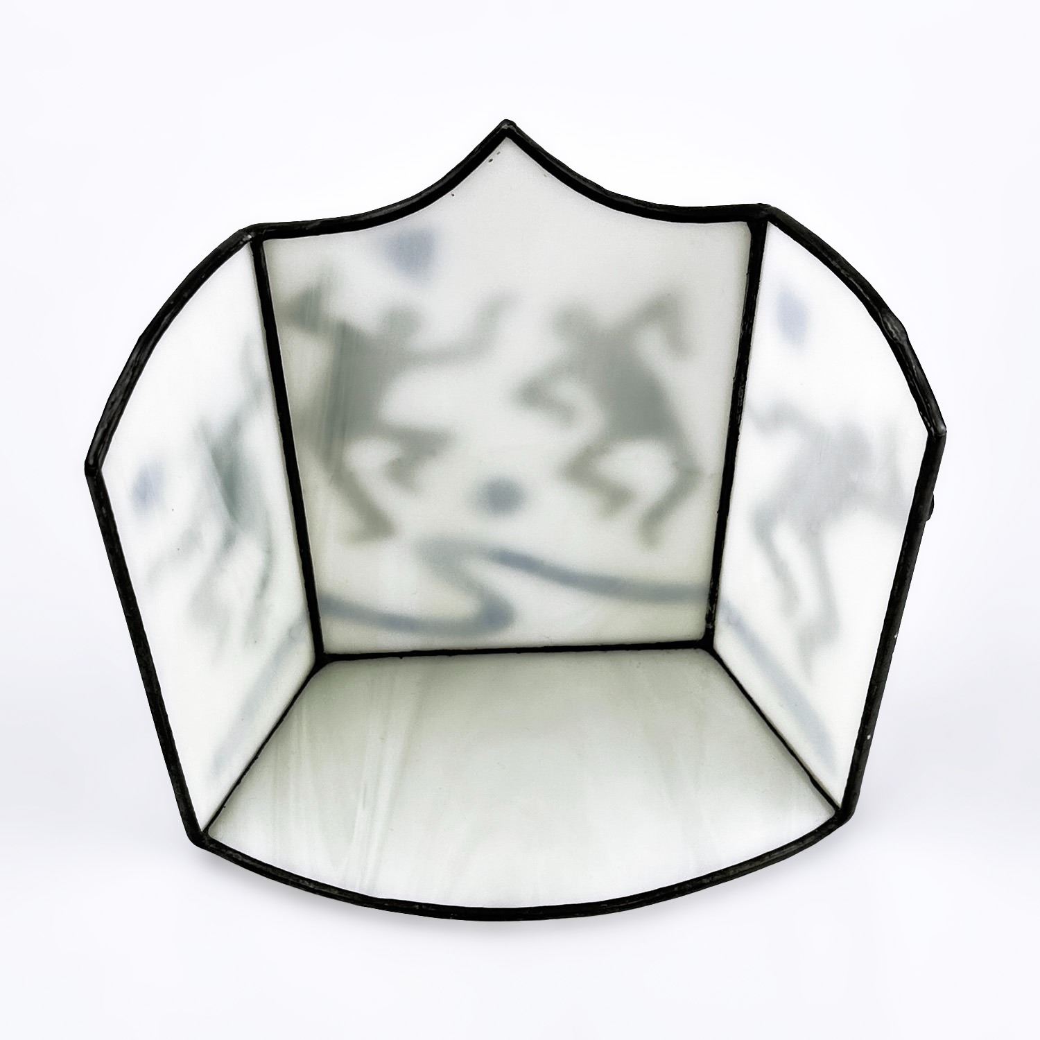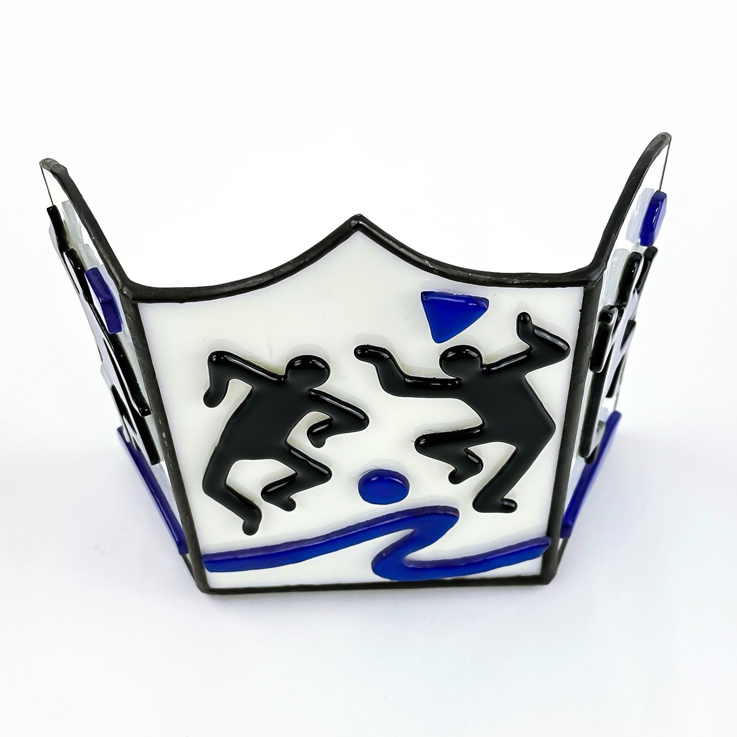 #8530 - STAINED GLASS STYLE VOTIVE OR TEA LIGHT CANDLE HOLDER. RAISED 3D ART GLASS DANCER THEMED SCULPTURE. NO CRACKS, CHIPS OR REPAIRS. MEASURES 6 1/8” (15.5 CM) TALL BY 6.25” (16 CM) WIDE AND 3.25” (8 CM) DEEP