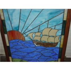 STAINED GLASS WINDOW WITH SHIP SCENE. Wooden frame. 29.75" x 38.5"