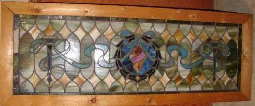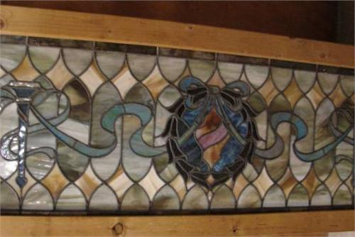 STAINED GLASS WINDOW. Decorated with ribbons, torches, and shield. Missing one glass panel. 21.25" x 56" framed.