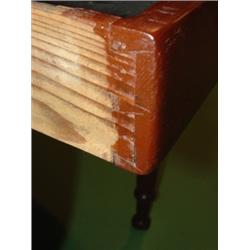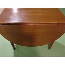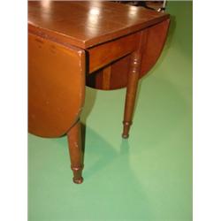 STAINED SOFTWOOD DROP-LEAF FARM TABLE. Single dovetailed drawer. 'D' shaped leaves. Turned legs. 29" H, 20" W (closed), 60" W (open), 39.5" L