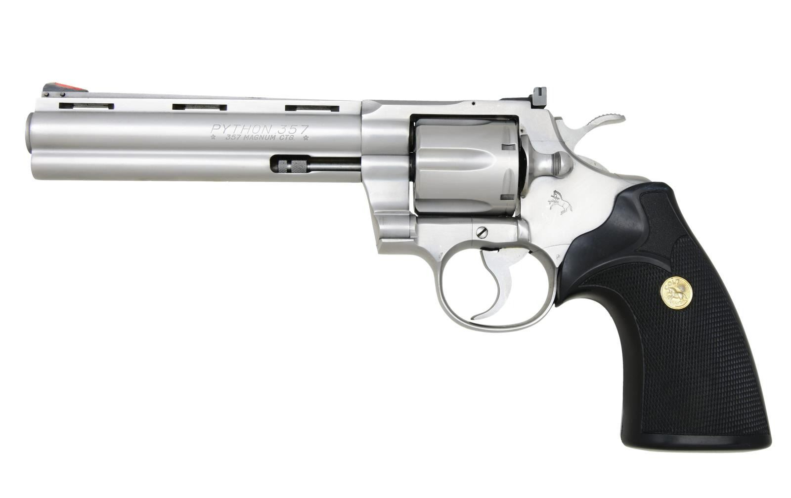 Cal. 357 Mag. S# T16486. Bbl. 6". Python double action revolver mfg. by Colt circa. 1983. Left side of the bbl. is marked "PYTHON .357/ * .357 MAGNUM CTG. *", with Colt's single line address marked across the right. Left side of frame is marked with the Rampant Colt logo and Colt's "VP" proof. Metal components exhibit a stainless steel finish overall. Frame is mounted with a 1-piece checkered black rubber Colt gold medallion Pachmayr Presentation Grip. V/R with serrated ramp front sight and blued adj. square notch rear sight. CONDITION: very good, with metal components retaining the vast majority of their original stainless finish, exhibiting scattered superficial marks from handling and storage. Mirror bore, exhibiting well defined rifling throughout. Grip is excellent overall. (24-1889/MLW). MODERN. $2,000-3,000.