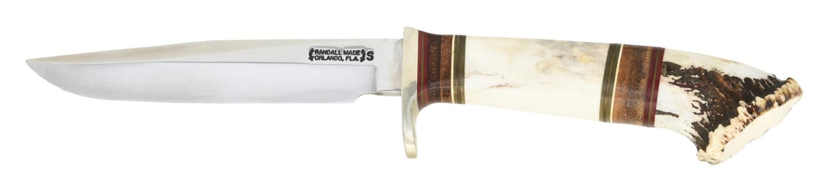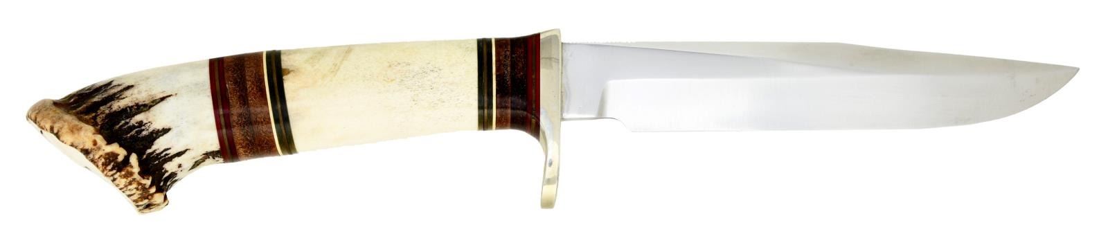 CAMP & TRAIL KNIFE. Clip point 6" blade w/ notches for thumb placement. Nickel silver single hilt. 6" Stag handle w/ leather & composite washers. CONDITION: knife appears in near excellent condition showing little signs of use. PROVENANCE: From the personal collection of Brad Shepherd. (02-19844/MD). $400-800.