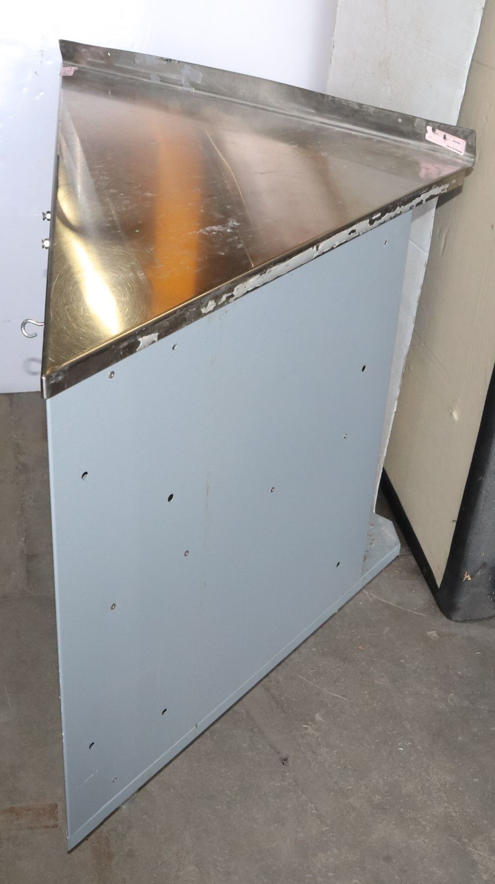 APPROX 34" COUNTER HEIGHT WITH 2" BACKSPLASH. TOP APPROX 34" X 34" X 48". STORED INSIDE/ OUTSIDE OF BUILDING SPACE PERMITTING