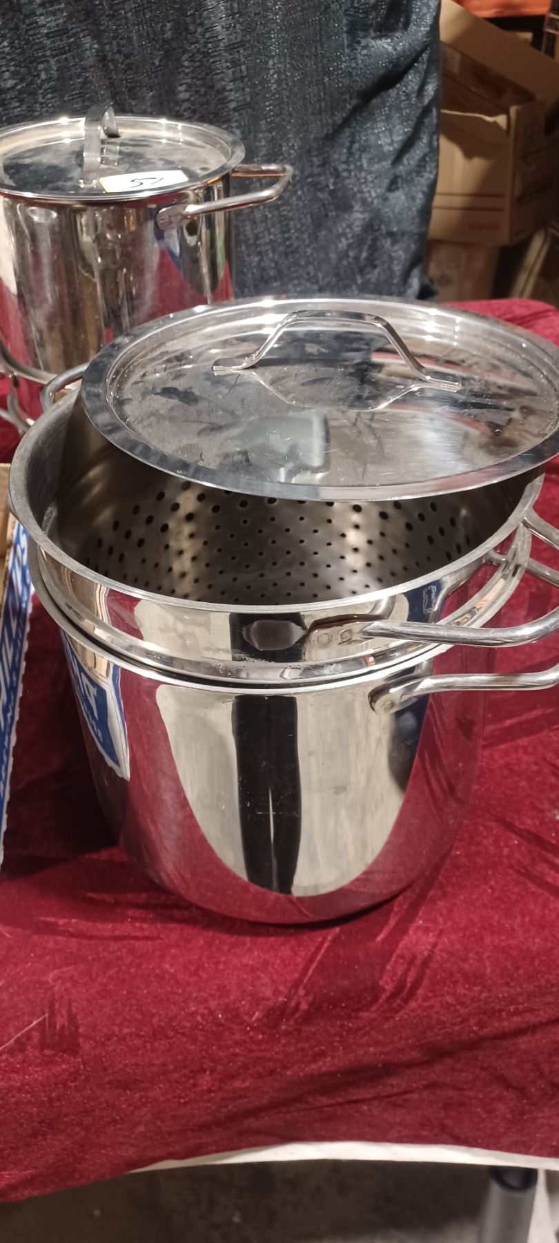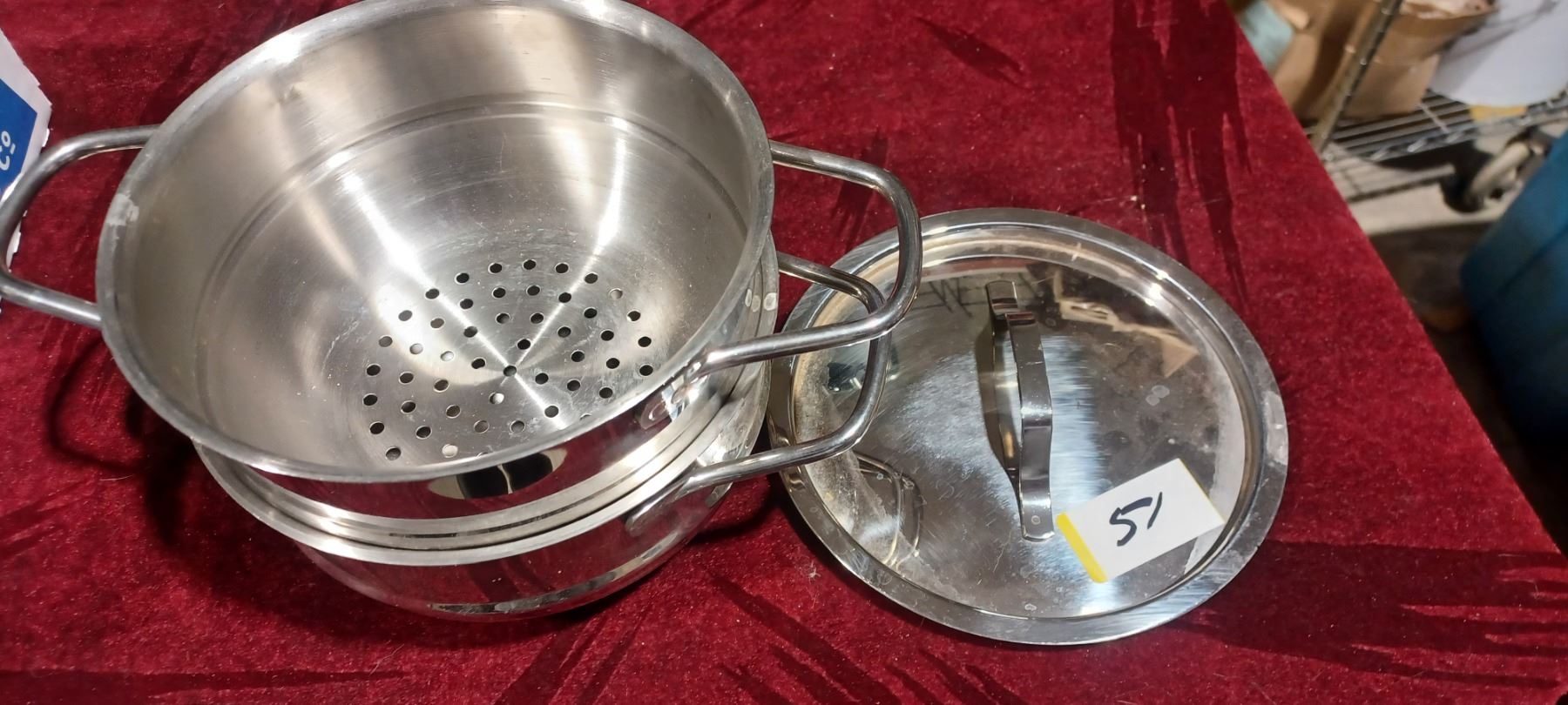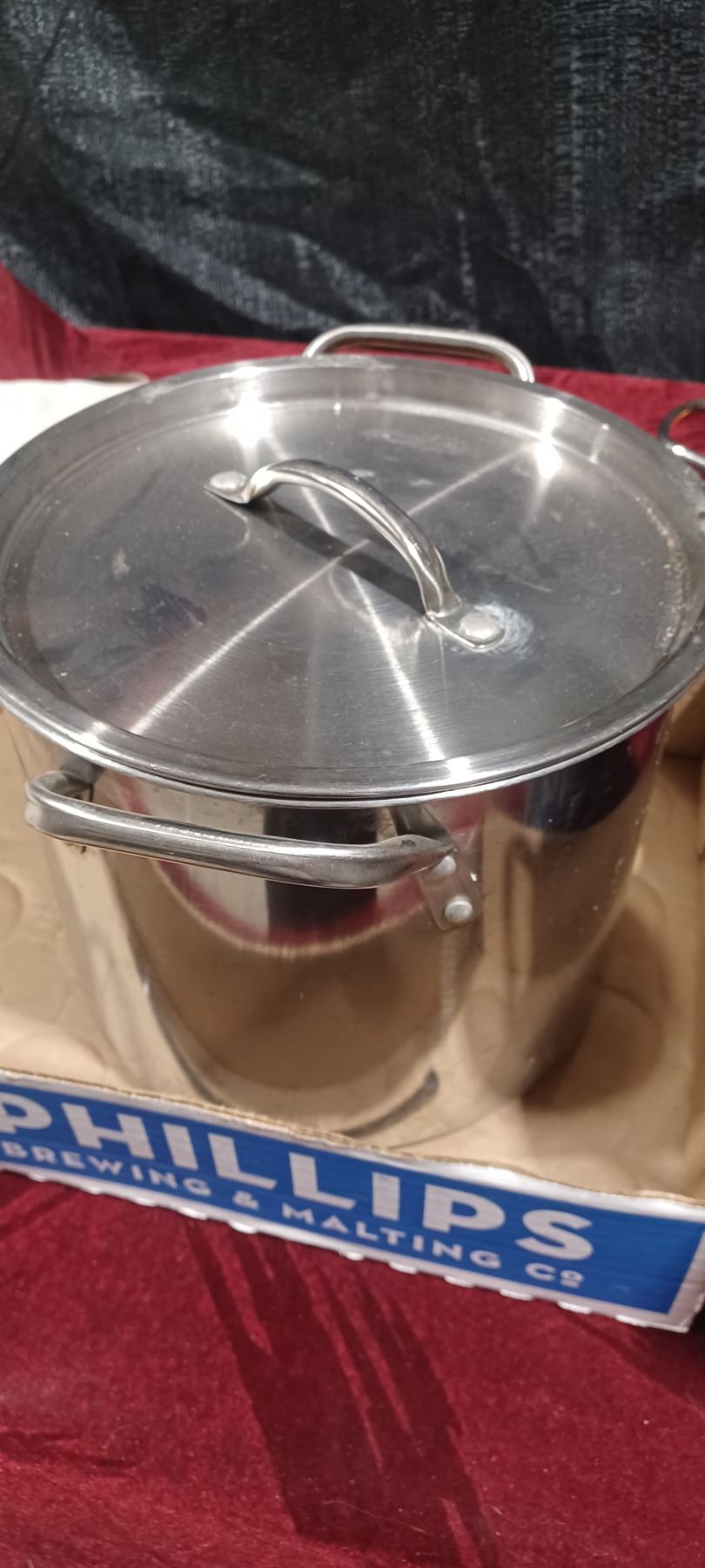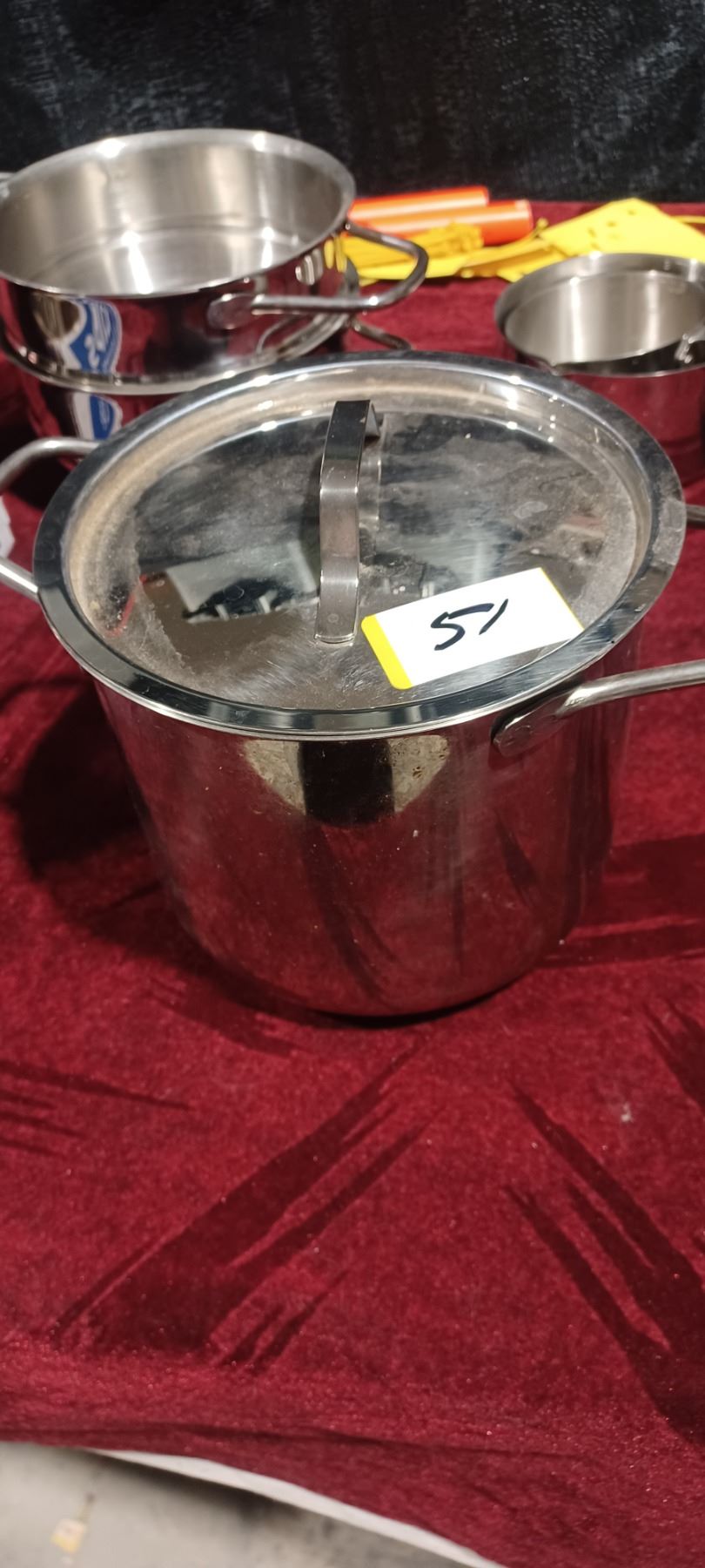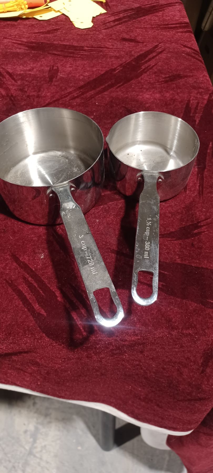 STAINLESS STEEL POT AND TWO MEASURING CUPS