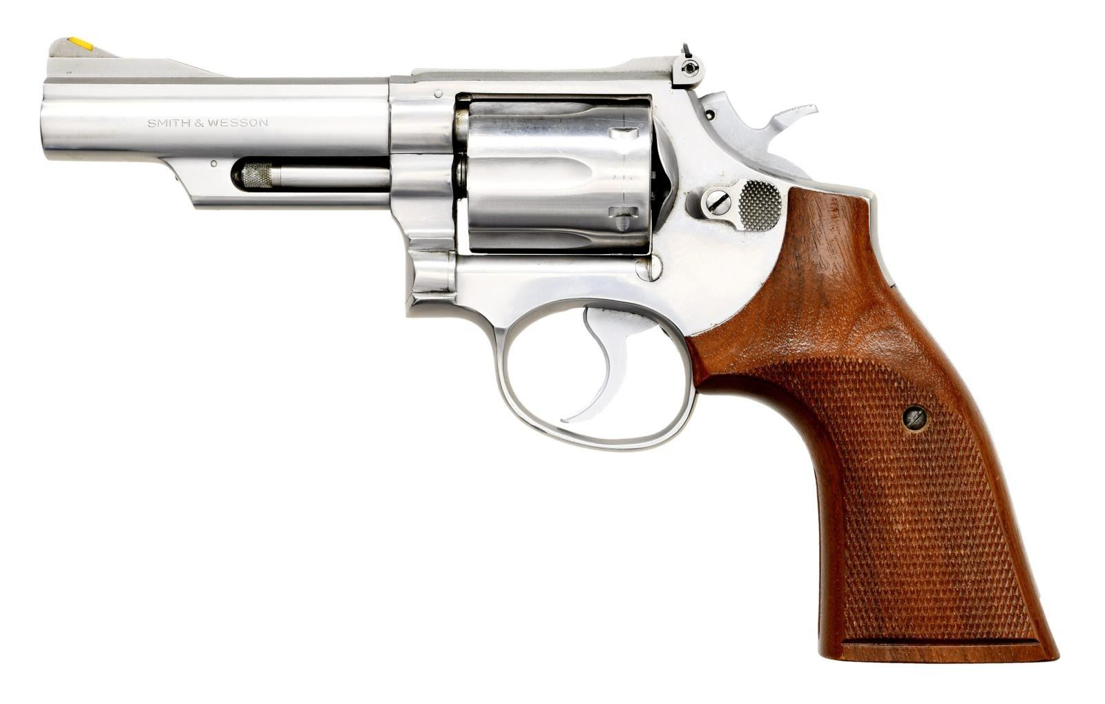 Cal. 357 Mag. S# 4K93316. Bbl. 4". Mfg. 1974. Stainless steel, double action revolver built on the square butt, 3 screw, K frame. Shrouded ejector rod. 6 shot fluted, counterbored cylinder. 10 groove serrated front strap & backstrap. .375" checkered hammer spur. .265 serrated trigger. 1/8" yellow ramp insert front, w/ white outline micrometer click adjustable rear sights. Large S&W logo on right sideplate. Checkered hardwood grips w/o S&W medallions. CONDITION: exterior surfaces demonstrate typical use, in the form of some light scratching & shiny surfaces. Aftermarket grips are in very nice condition, w/ sharp checkering & some light impressions. Timing appears correct. Bore is bright w/ strong rifling.(23-2348/JZ). MODERN. $400-600.