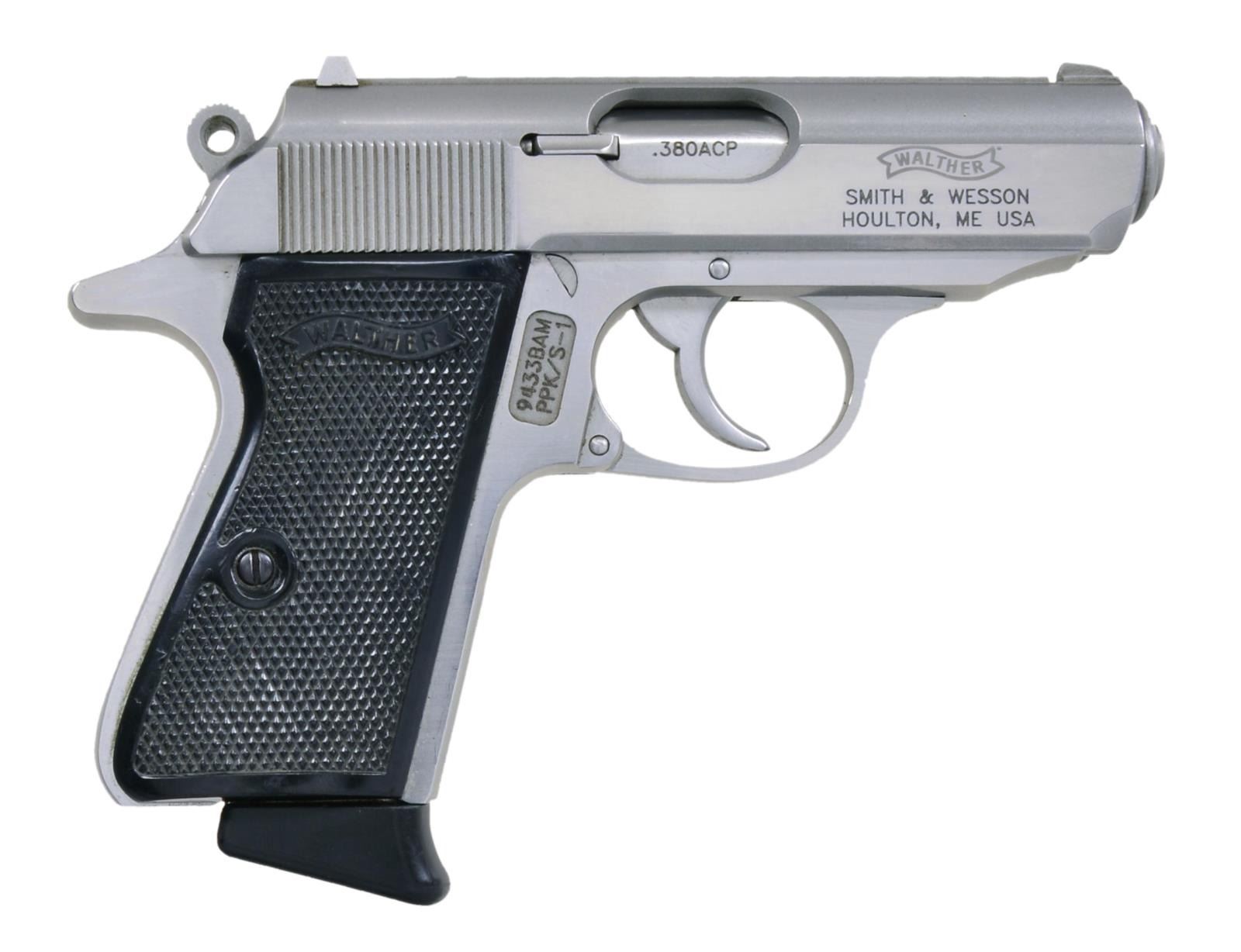Cal. 380ACP. S# 9433BAM. Bbl.3.3". Traditional double action. Manufactured by Smith & Wesson in Houlton, ME, USA. Stainless steel. Frosted finish on top of slide. Rear serrated slide, flat top, w. weave serration. Fixed sights. Left side safety / decocker. Serrated hammer spur. Black plastic grips w/ Walther insignia. MAGS: 2 factory 7rd. UNATTACHED ACCESSORIES: Factory box, not numbered to firearm. CONDITION: No apparent blemishing on finish aside from a few light drag lines. Grips illustrate a few small imperfections, visible under close inspection. Bright bore w/ strong rifling. (22-3574/JZ). MODERN. $400-600