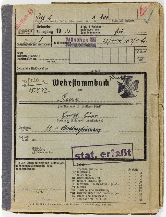 Service record of SS-Totenkopf Rottenfuhrer Horst Guse, 50pp. 8vo., setting forth all of the soldier's personal information and his service record. Guse was born in 1922 and would die in the service in Aug. 15, 1942. The record shows that Guse was in Dachau from Oct. 17, 1939 until Apr. 30, 1940. On May 1, 1940 Guse was stationed at Weimar until June 20, 1941 and the next day he was transferred to the 2nd SS Sonder Battalion with whom he remained until his death on Aug. 15, 1942. Of course, the sonderkommandos were responsible for mass murders of Jews and civilians. Guse served in Holland and then fought partisans in Smolensk where it appears he was killed.