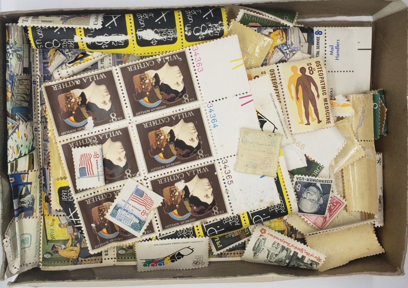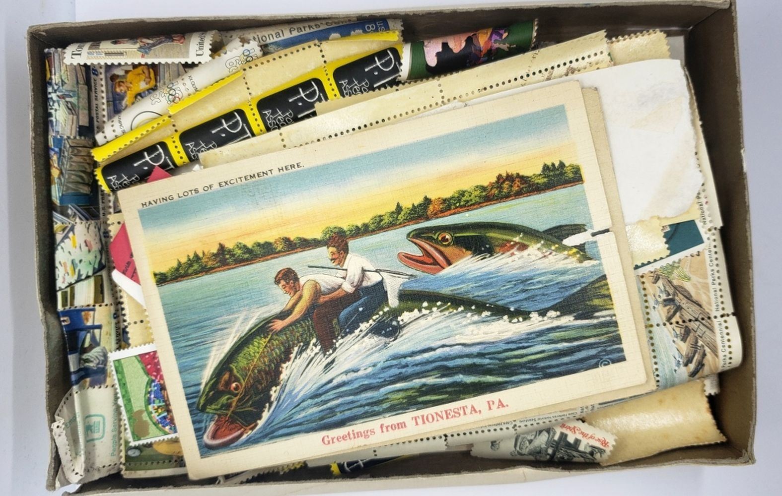 only a few stamps have been used in this box - comes with 2 vintage postcards