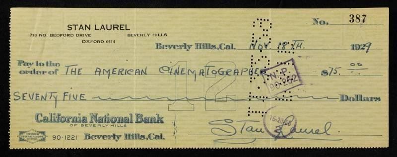 A Stan Laurel signed check, numbered 387, dated November 18, 1929, written to "The American Cinematographer" in the amount of $75 and drawn from an account at California National Bank.