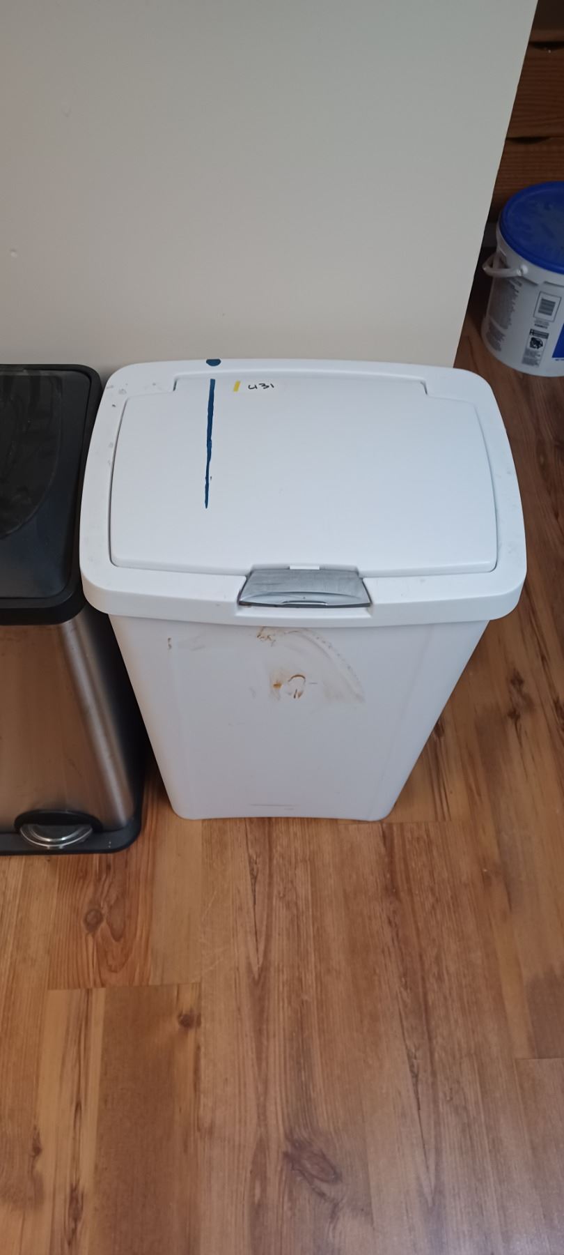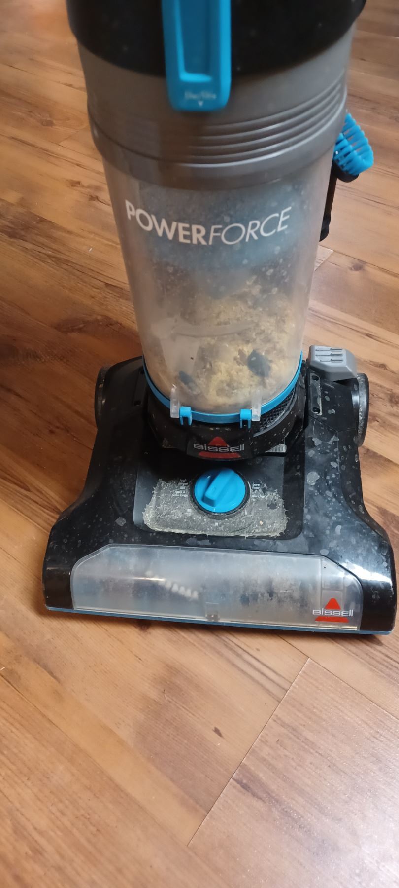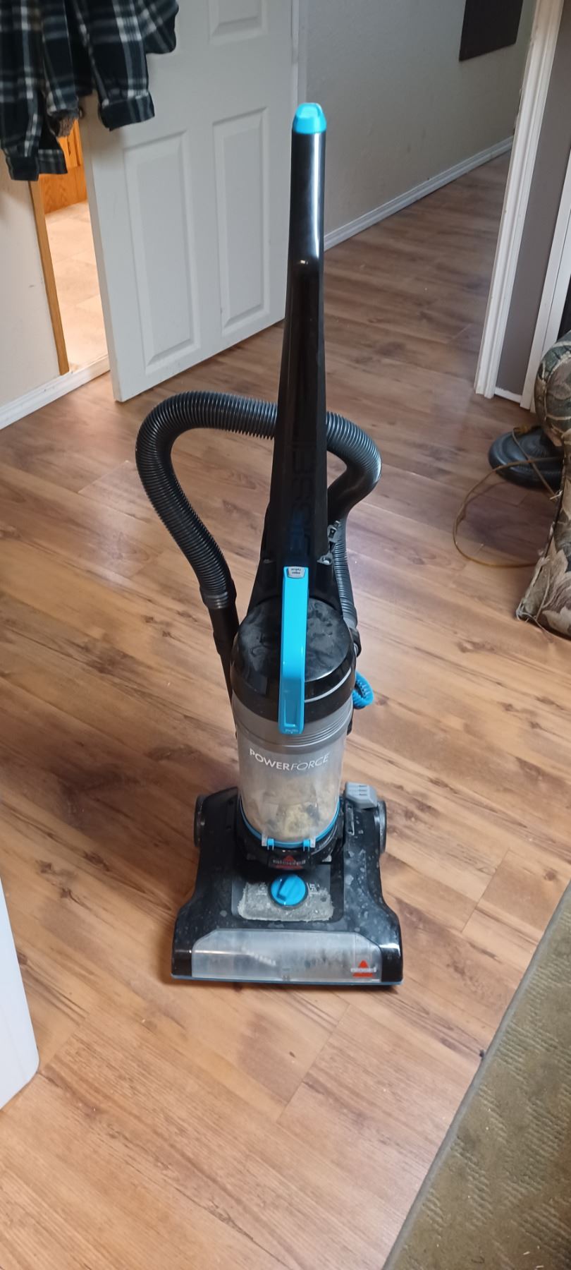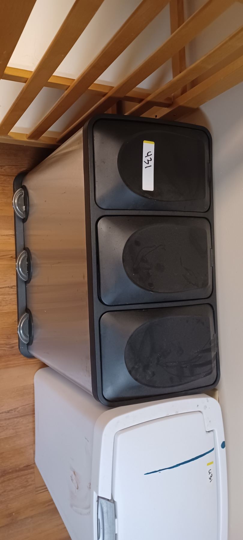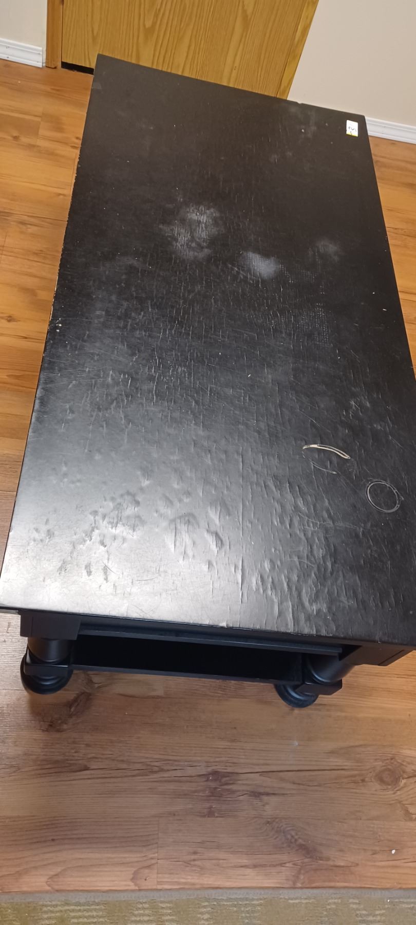 STAND, BLACK COFFEE TABLE, GAME. BISSELL UPRIGHT VAC.AND 2 GARBAGE CANS