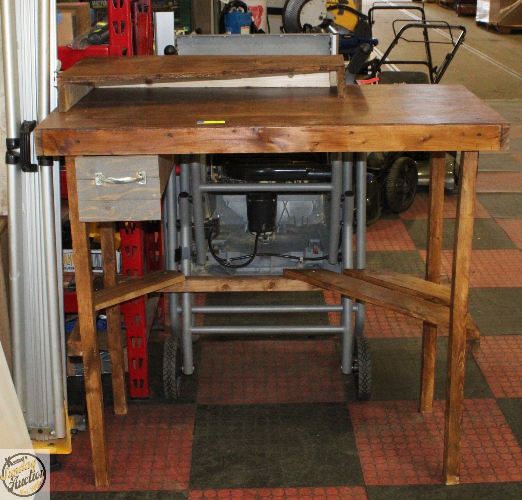 STAND UP SHOP DESK WITH MONITOR RISER **ALL ITEMS MUST BE REMOVED BY 5PM SATURDAY, JULY 26th 2025. ALL REMAINING ITEMS WILL BE SUBJECT TO A $6.00 PER DAY STORAGE CHARGE. ANY ITEMS REMAINING AFTER MONDAY, AUGUST 11TH 2025 WILL BE CONSIDERED FORFEITED. NO REFUNDS WILL BE ISSUED FOR FORFEITED ITEMS. TO SCHEDULE A PICK UP APPOINTMENT CLICK HERE