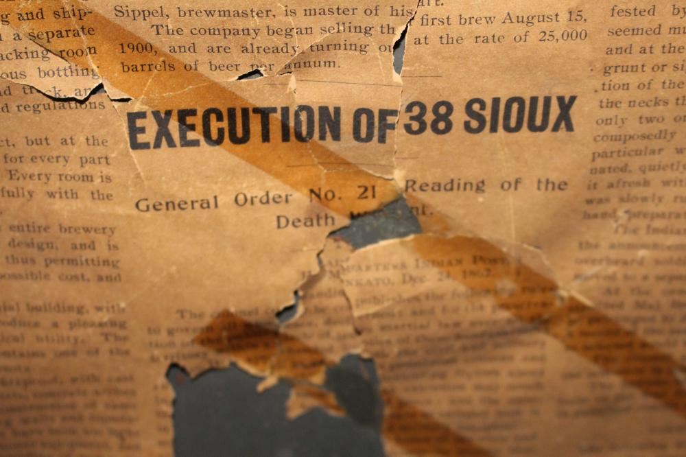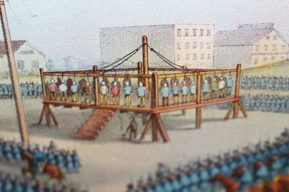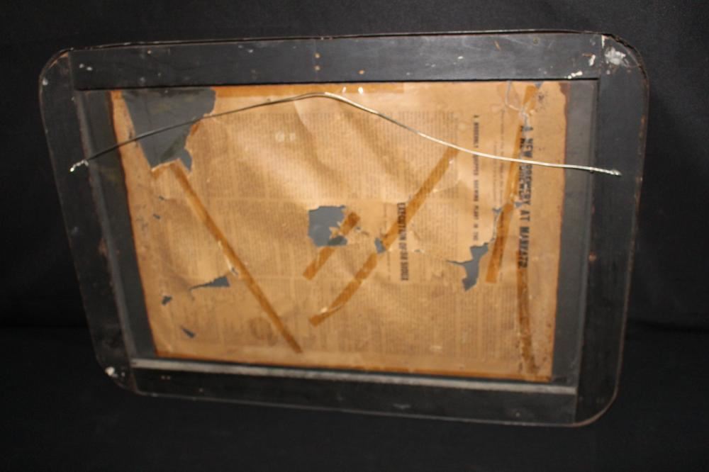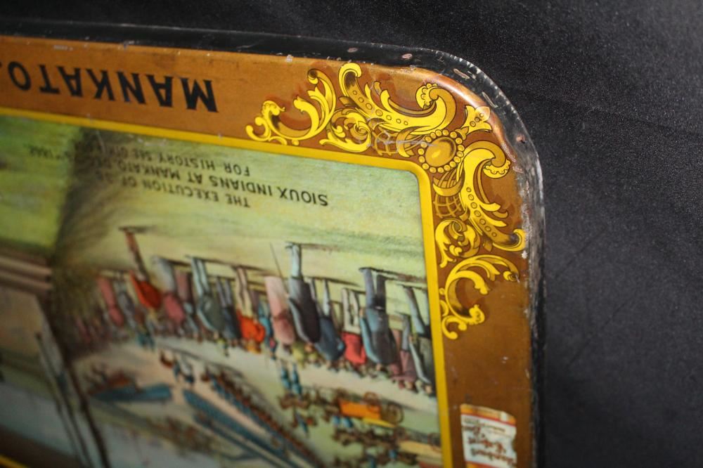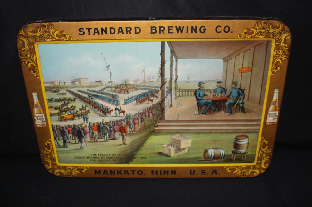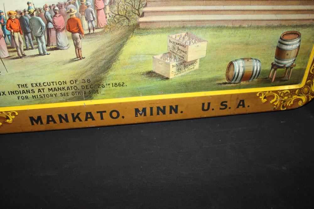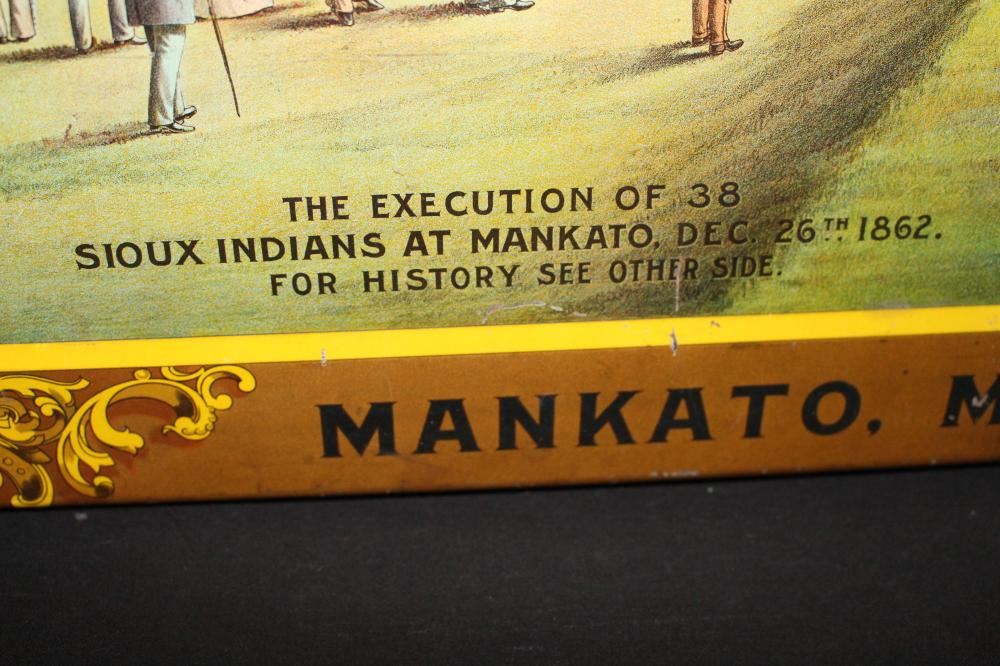 SST, 26X18. IMAGE ON THE SIGN IS OF THE MASS EXECUTION OF 38 SIOUX INDIANS IN MANKATO MINNESOTA. HAS SOME LIGHT WEAR. OVERALL VERY NICE. VERY RARE SIGN. APPROXIMATE SHIPPING COST $50 TO $75. THIS ITEM IS GUARANTEED TO