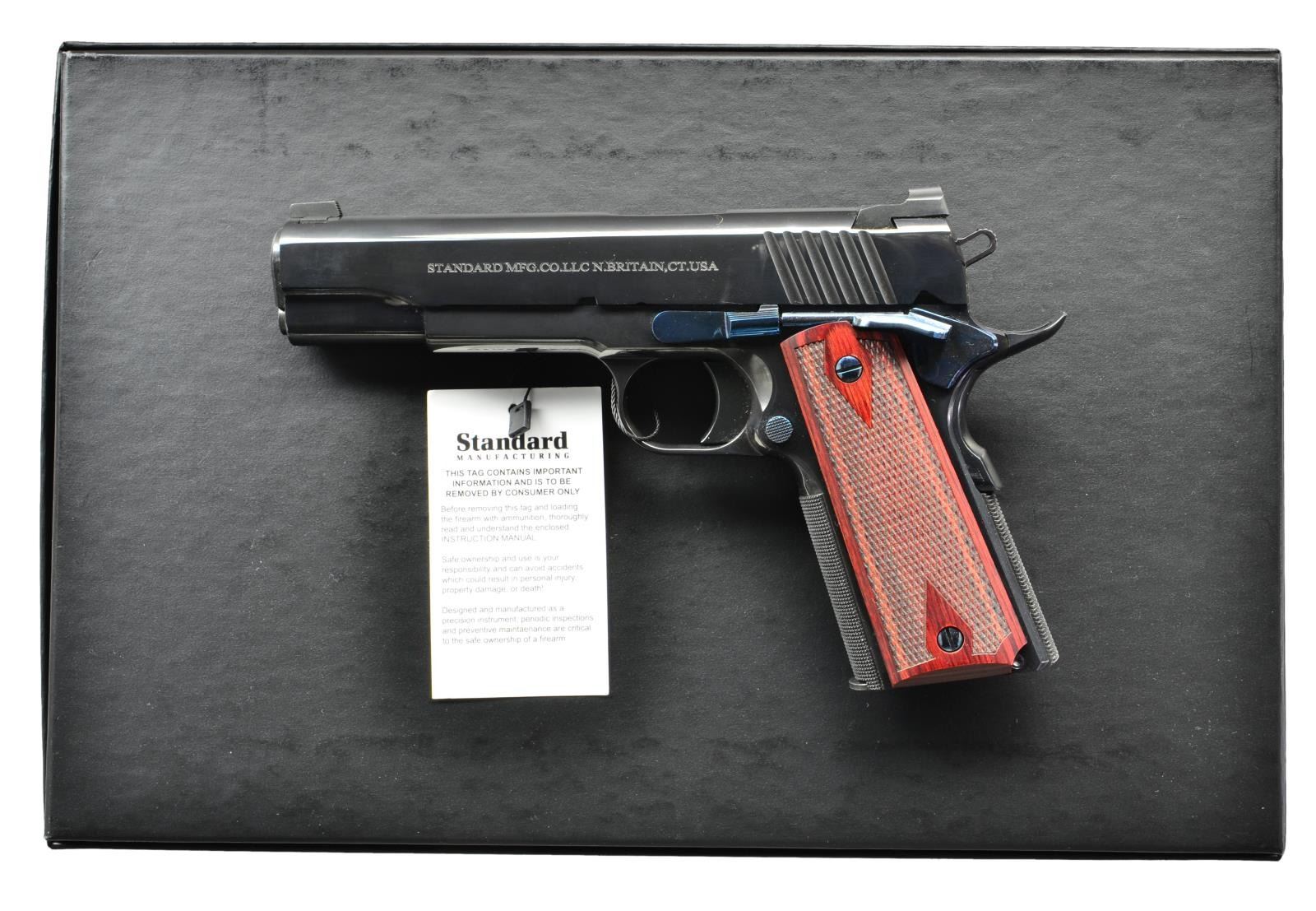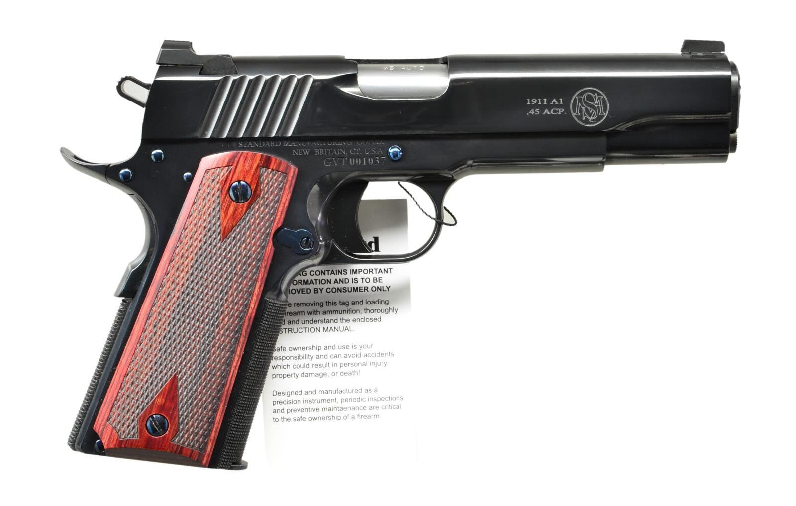 Cal. 45 ACP. S# GVT001037. Bbl. 5". Low profile sights fitted on a blued serrated slide. Pierced Hammer. Extended grip safety spur. Smooth trigger. Checkered grip straps. Attractive Nitre blued pins and small parts. Rosewood double diamond grips. MAGS: 2 - 7rd. UNATTACHED ACCESSORIES: Original box & paperwork. CONDITION: All aspects like new with only a few very minor markings. MODERN (22-3907/ZAL) $1000-1500