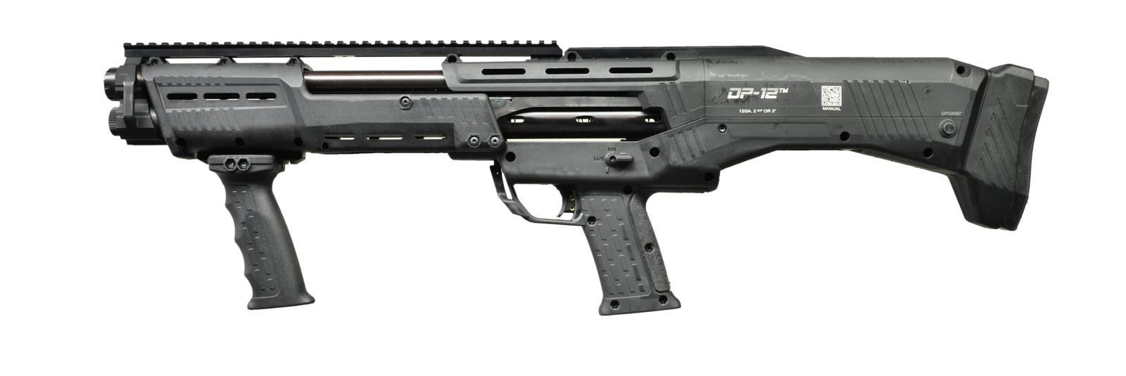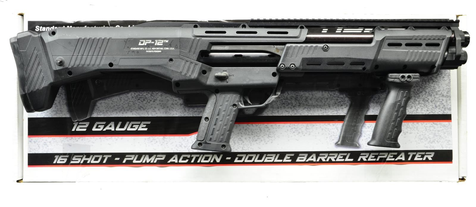 Cal. 12GA 2 3/4" & 3". S# DP02087. Bbls. 19" An exciting concept in the double barrel shotgun arena, combining it w/ a pump action. Each barrel is threaded for choke tubes w/ Tru-Choke thread patterns. Each time the action is cycled, it loads both barrels and ejects the spent shells from both barrels. The trigger may then be depressed twice, firing each barrel, individually. Each barrel has its own feed tube, holding 7 rounds each, providing a whopping 16rd capacity in total, if each barrel is loaded manually as well. Black chassis w/ a mix of blued & parkerized steel. Ambidextrous safety. Black rubber recoil pad. Vertical foregrip. 14" picatinny rail for sight mounting. MAGS: 2 onboard tubes, at 7rds each. Weight is 10# 5oz. unloaded. UNATTACHED ACCESSORIES: Factory box w/ lock & paperwork as well as black nylon carry bag. CONDITION: Finish on exposed surfaces complete & consistent w/ some light drag lines on some areas of mechanical intervention such as where action rubs on feed tubes, which happens almost immediately. Some other scattered light lines indicative w/ rack storage & light use. Bores have some residue buildup necessitating cleaning beyond a quick patch. Fire control mechanism appears to function correctly when cycled by hand. (22-3489/JZ). MODERN. $800-1,200