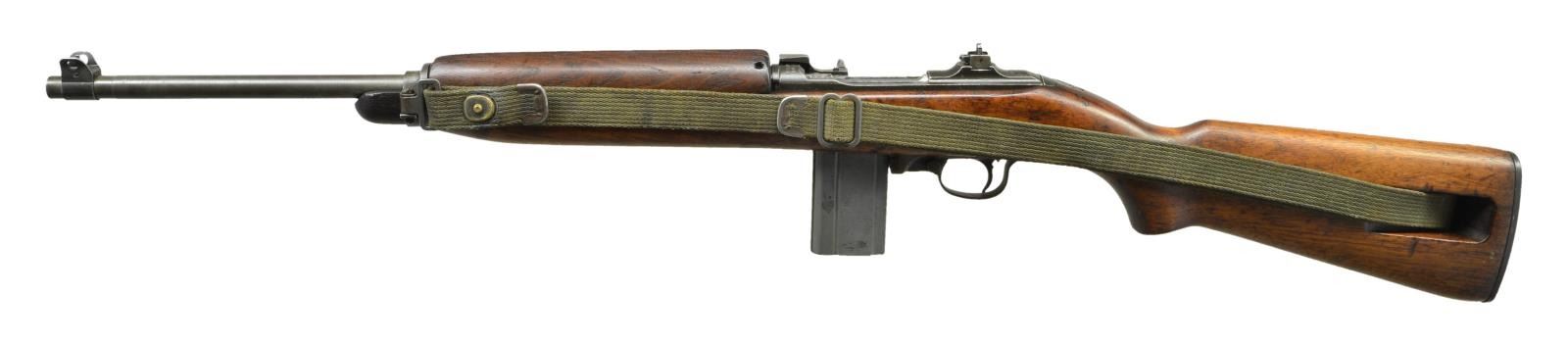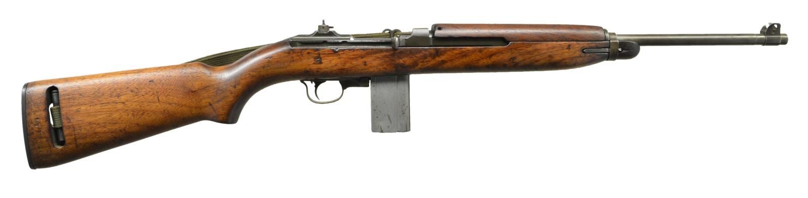 Cal. 30 Carb. S# 2180789. Bbl. 18" Underwood dated 1-44 plus flaming bomb proof. Circled "S" in operating rod plus "102" on bottom. "42S" flat top bolt plus "10C" on left front of receiver. Welded trigger guard on "ST" marked trigger housing having plain push button safety. "S" on L flip rear sight. "STANDARD PRODUCTS" on recoil block plus "SW" on hammer. Unmarked late low wood stock plus 2 rivet handguard w/ deep groove plus "S-HB" on underside. Green canvas sling w/ lift the dot brass snap plus oil bottle retainer. MAGS: 1 fair refinished (grey parkerizing) 15 rd. marked "SW". UNATTACHED ACCESSORIES: good "E.A.BROWN MFG.CO. 1944" marked canvas muzzle cover. CONDITION: good appearance w/ use wear throughout including sling. Light stock marks w/ handguard having best appearance; both arsenal type refinished plus small crack behind recoil block. Near excellent bore. PROVENANCE: from the estate collections of Charles P. Obremski. (22-1400/NW). CURIO. $900-1,400.