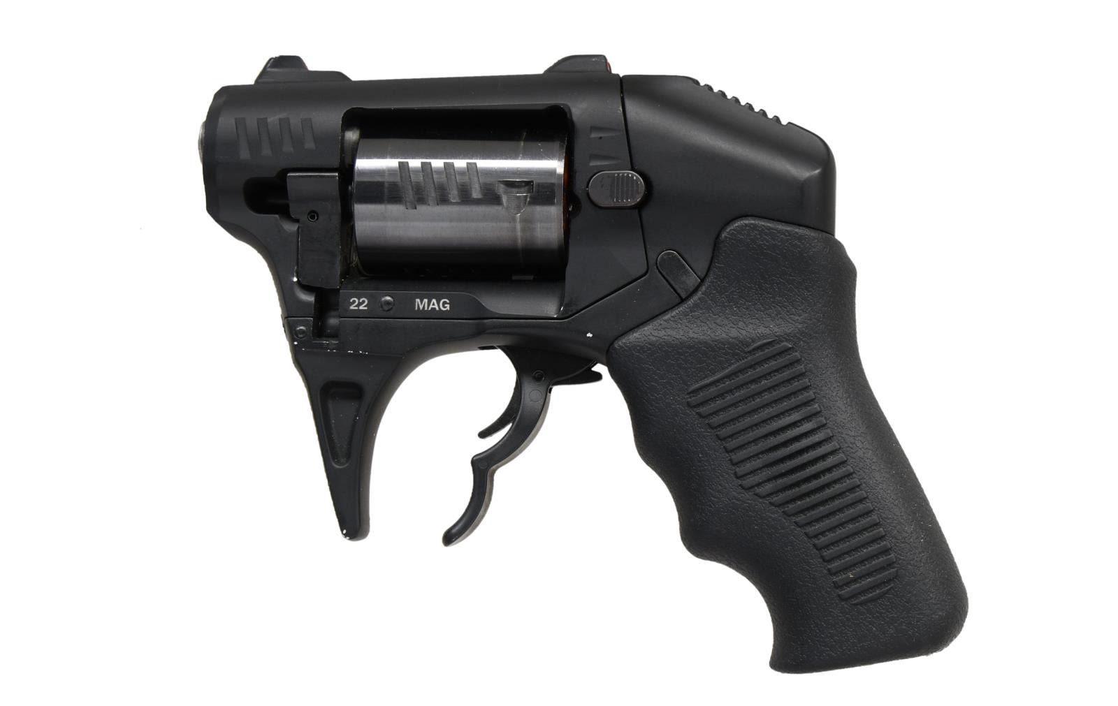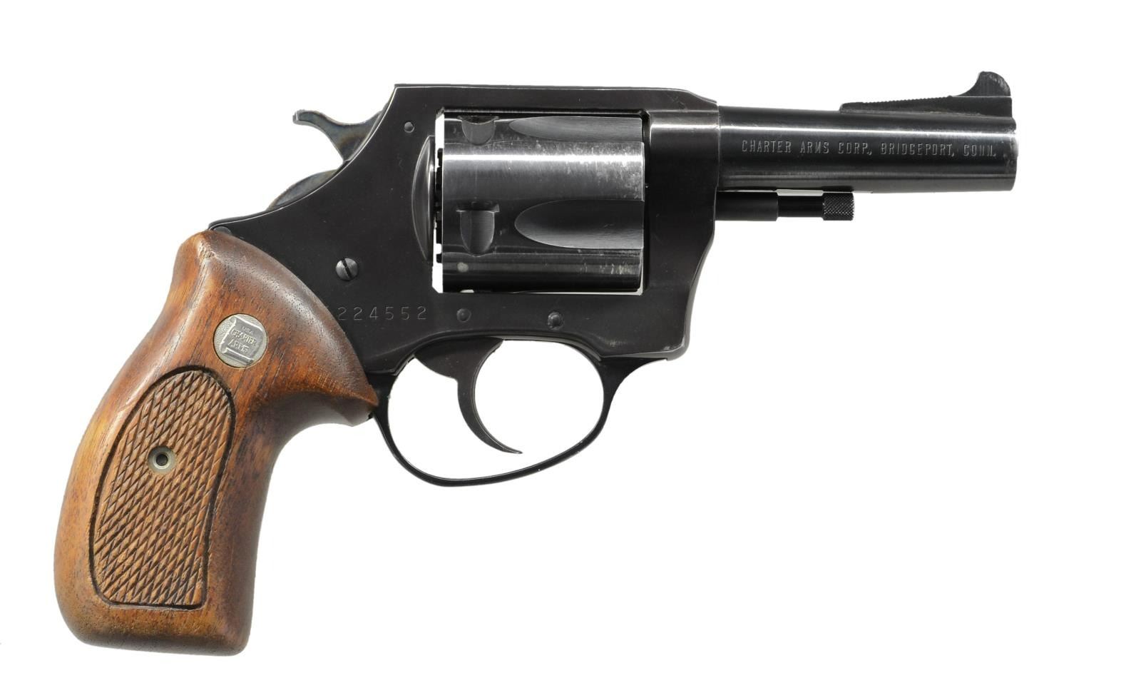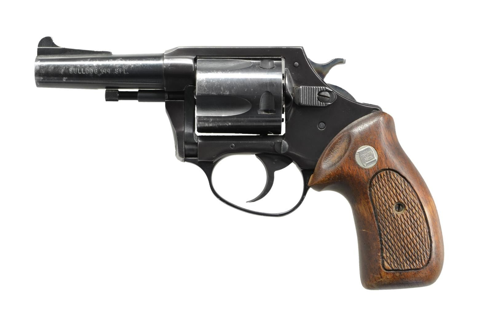 1) STANDARD MFG. CO. S333 THUNDERSTRUCK. Cal. 22 Mag. S# SVF014941. Volley fire DA revolver w/ 1 1/4" bbls. 8 Shot cyl. Red 3 dot sights. Dbl. cantalever trigger w/ safety. One piece rubber grip. CONDITION: near excellent metal finish w/ scattered wear spots. Near excellent grip. Near excellent bores. (23-1483/MD). 2) CHARTER ARMS BULLDOG. Cal. 44 Spl. S# 224552. Bbl. 3" w/ blade front sight. 5 Shot fluted cyl. Two piece checkered hardwood grips w/ Charter Arms medallions. CONDITION: Very good blue showing holster associated wear on bbl. & cyl.; frame has acquired a plum hue. Very good grips. Very good bore. (23-1484/MD). ALL MODERN. $400-600.