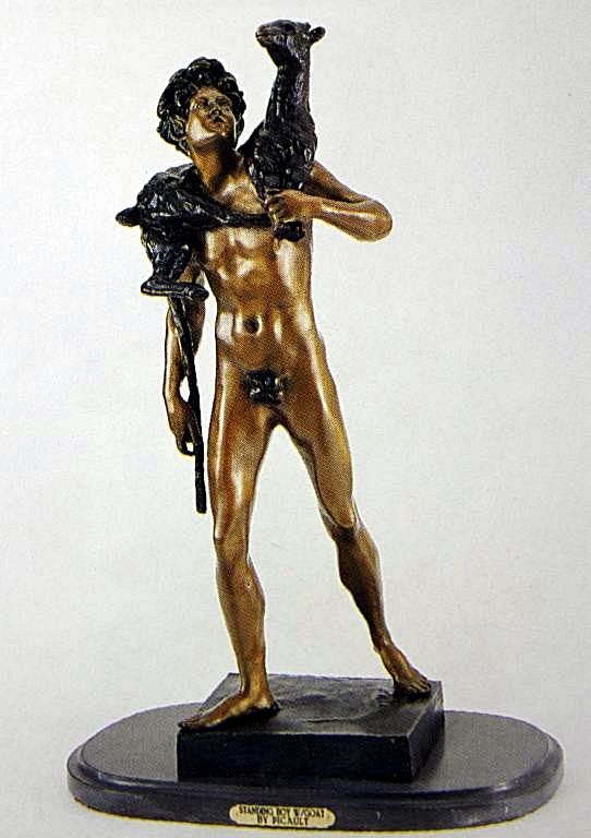 "STANDING BOY" BRONZE SCULPTURE - AFTER PICAULT - BEAUTIFUL COLOR PATINA - MOUNTED ON A FINE ITALIAN MARBLE BASE - BEAUTIFULLY DETAILED - SIGNED - MINT CONDITION - 27"H X 11"W - LOST WAX CAST BRONZE