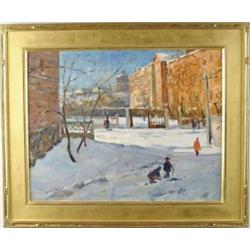 Lot # 99 STANISLAV VASILEVICH PETRASHEVSKI (Russian, 1935-) MORNING SUN. Fine oil on board scene shows several people in winter city landscape. Two children are seen playing in snow covered ground with sunlight hitting brick buildings and snow covered park. Signed in Cyrillic initials lower left. Housed in a fine carved gilt replacement frame. The back with inner plexiglass window which reveals a finished still life painting of fruit on table setting. PROVENANCE: Estate of the artist; Gallery Wilnitski, Vienna, Austria. Massachusetts Collection. SIZE: 22” x 27-1/2”. CONDITION: Very good, some inpainting. 9-98830 (1,500-2,500)